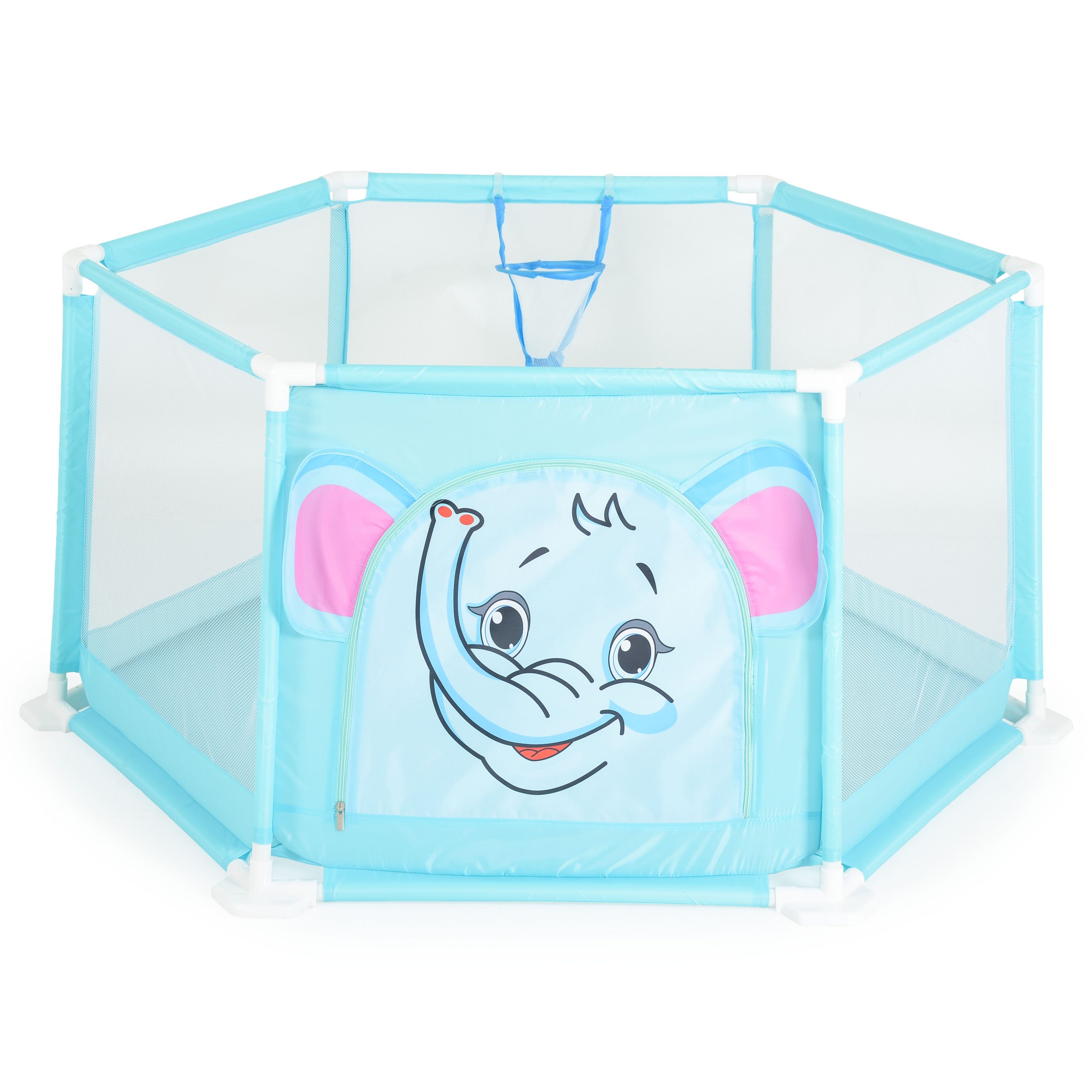 146 cm playpen with 50 pcs. colored balls. PVC bases. Easy to assemble Zipper opening. Basketball hoop.