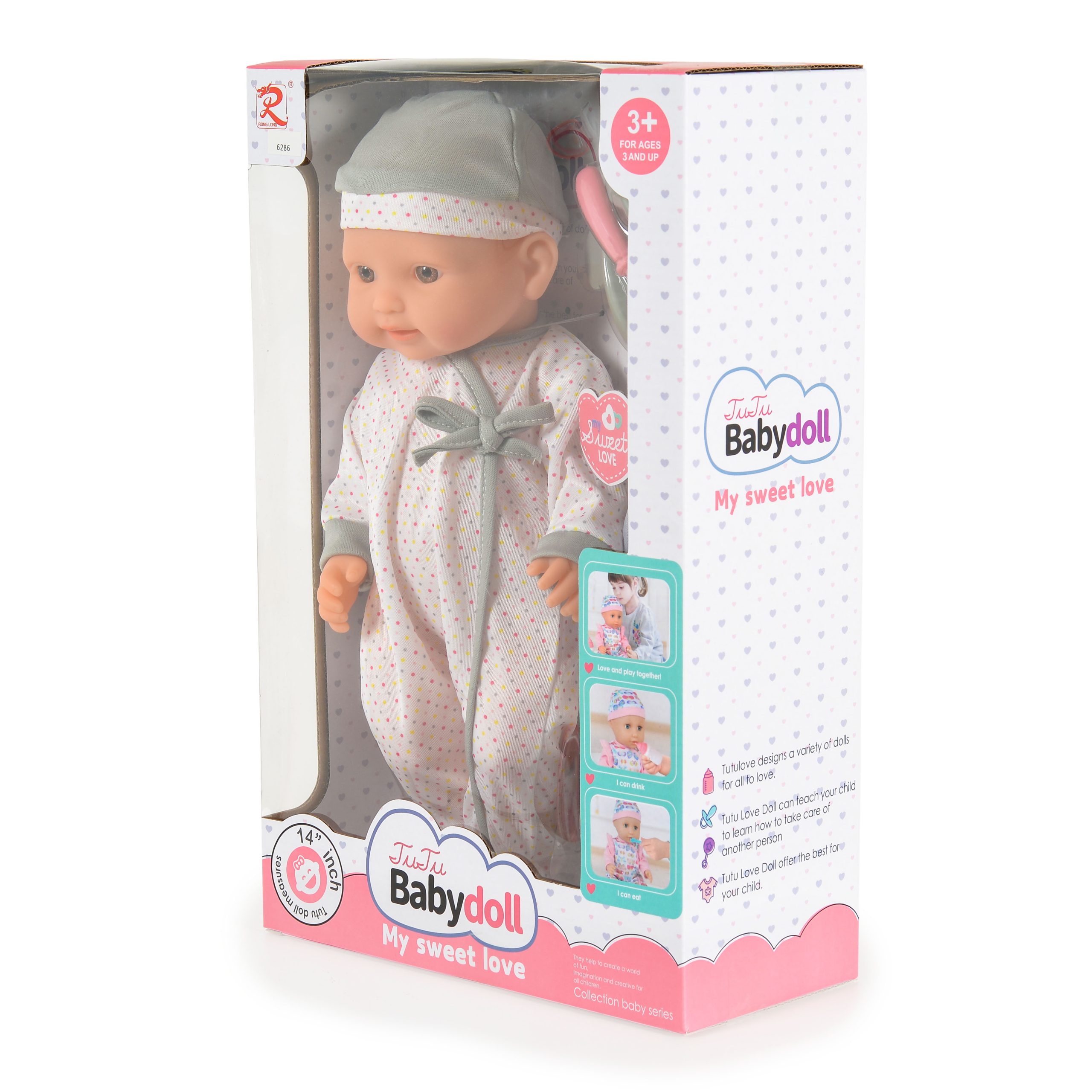 36 cm doll with accessories. The set includes a bowl with a fork and spoon, a bottle, a diaper and underpants. The included bottle is a toy and is not suitable for babies or children. The product is intended for children over 3 years of age.