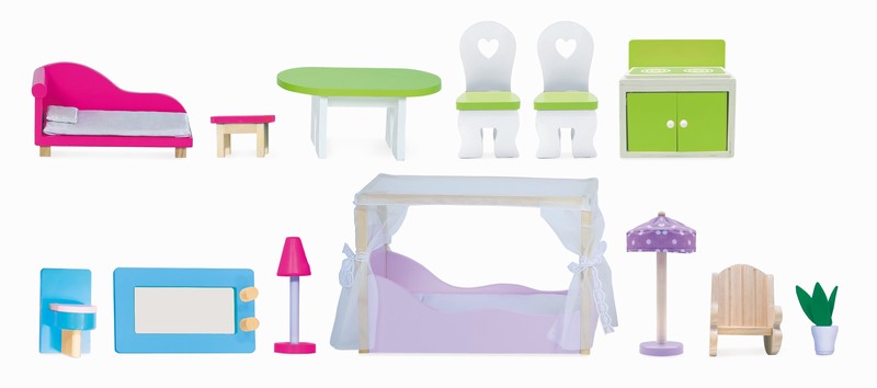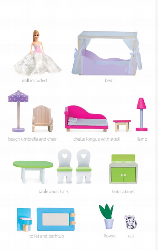Wooden dollhouse with three levels, suitable for children aged 3 and above. The set includes 14 pieces of furniture and a doll. With impressive dimensions – height 123.5 cm, width 84 cm, depth 38 cm – the house provides ample space for dolls up to 31 cm tall. Made from safe materials, it encourages the development of imagination, fine motor skills, and social abilities in children.