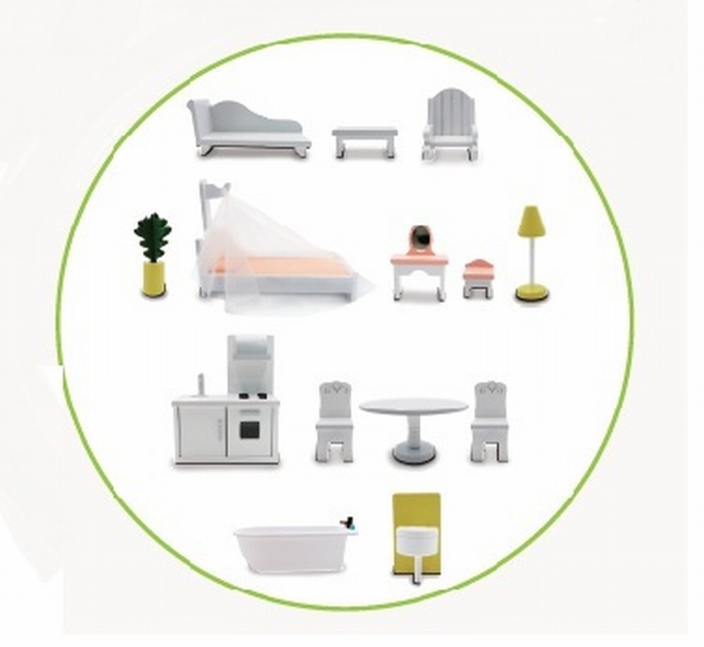 15 pcs colorful furnitures; 3 levels; 4 rooms and a terrace; staircase; suitable for dolls size from 24cm up to 30cm