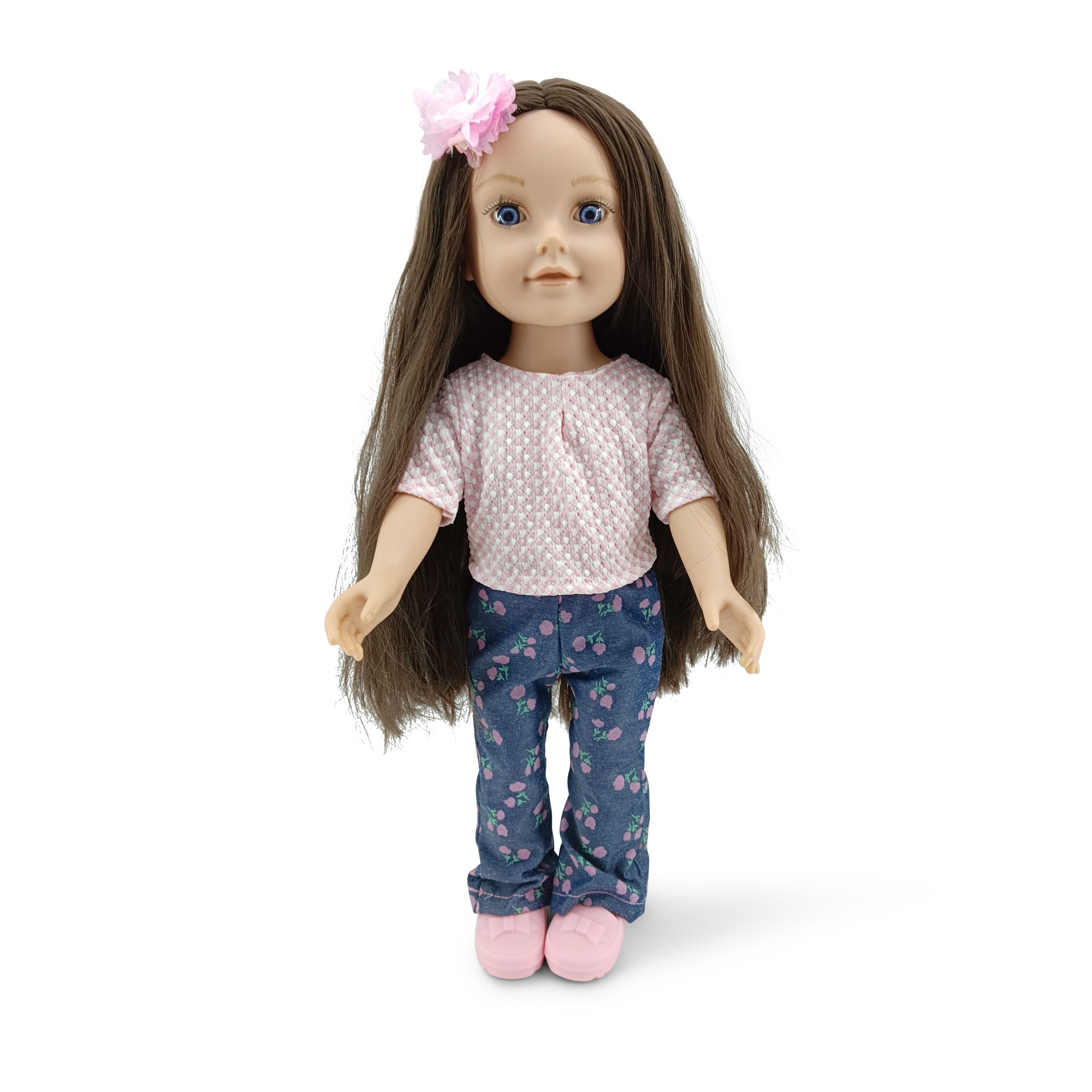 Realistic doll with a soft body, 46 cm in height, designed to inspire children`s imagination. The doll`s hair is made using a rooted hair technology, which ensures stability and allows the hair to be combed and styled without the risk of detachment, while also providing a natural look. The set includes hair accessories – a brush and a hair clip, making styling even easier. Suitable for children over 3 years old, the doll is made from high-quality and completely safe materials.