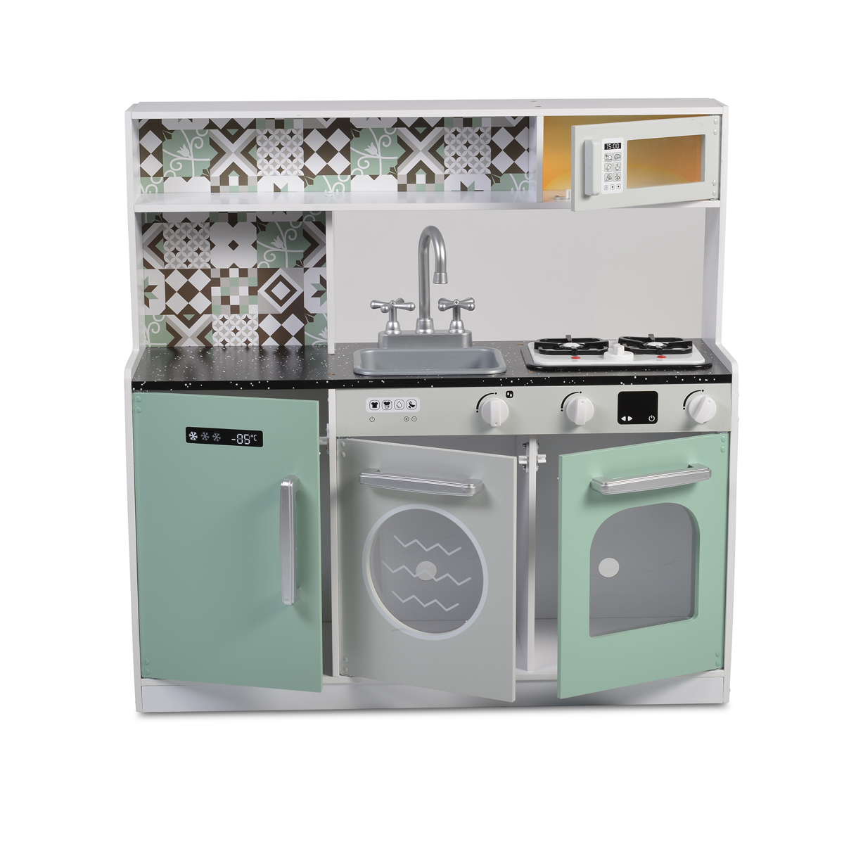 Children wooden kitchen including ; Height of the assembled kitchen is 80.00cm and width 78.50cm, length 29.00cm; The microwave is with openable door; The stove is with music; Realistic sink; Oven, washing machine and refrigerator with openable doors; For children over 3 years old