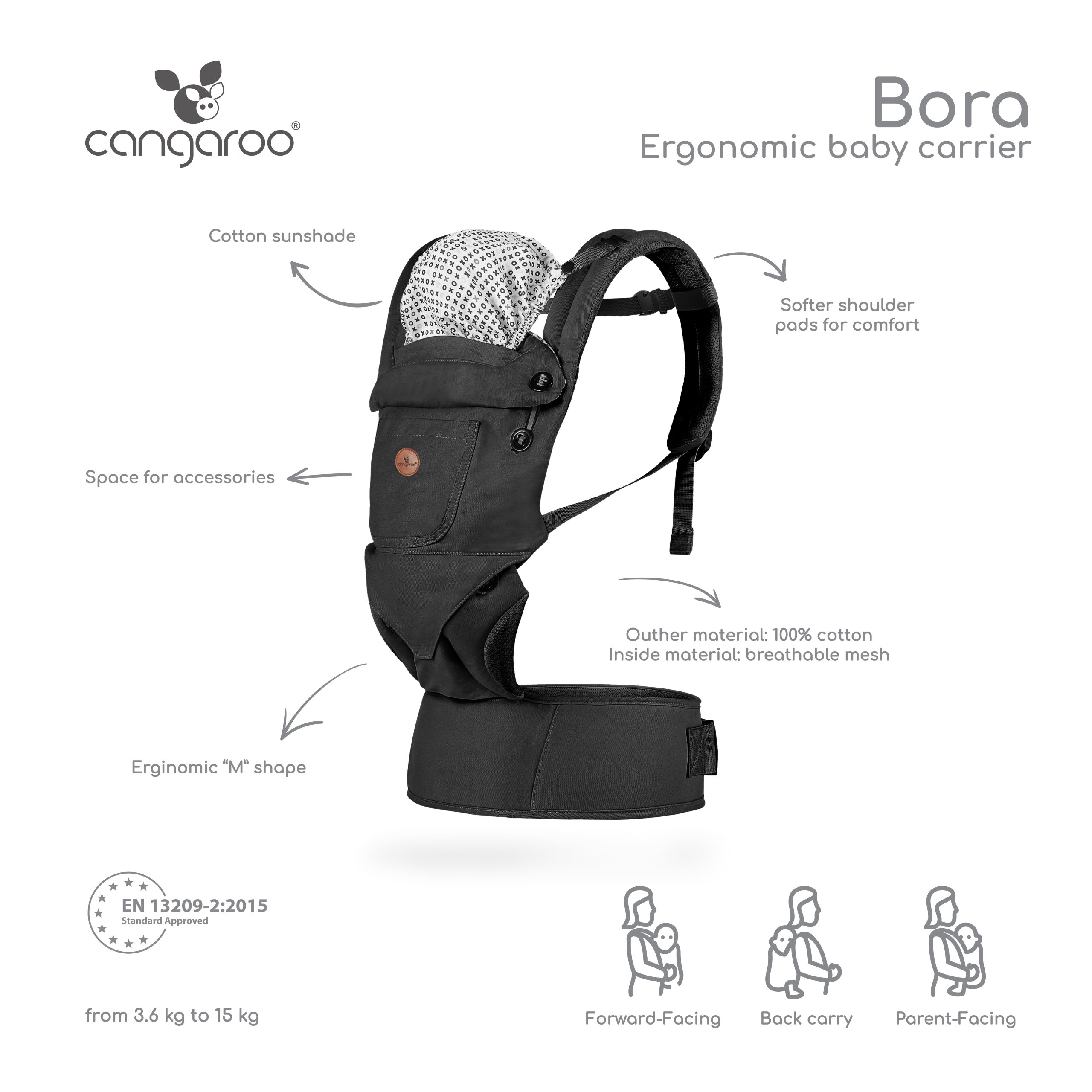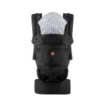 The baby carrier is suitable for children aged 5+ months up to 15 kg and can be used in three positions: facing the parent, facing forward, and on the parent`s back. It is made from high-quality materials: 100% cotton and a breathable mesh lining made of 100% polyester, making it suitable for all seasons. It features a hood to protect the baby`s head, a practical pocket for accessories, and ensures an ergonomic M-shape for the baby`s legs. A wide, adjustable waistband with velcro and padded shoulder straps evenly distribute the weight, protecting the parent`s back and waist. The product is suitable for hand washing.
