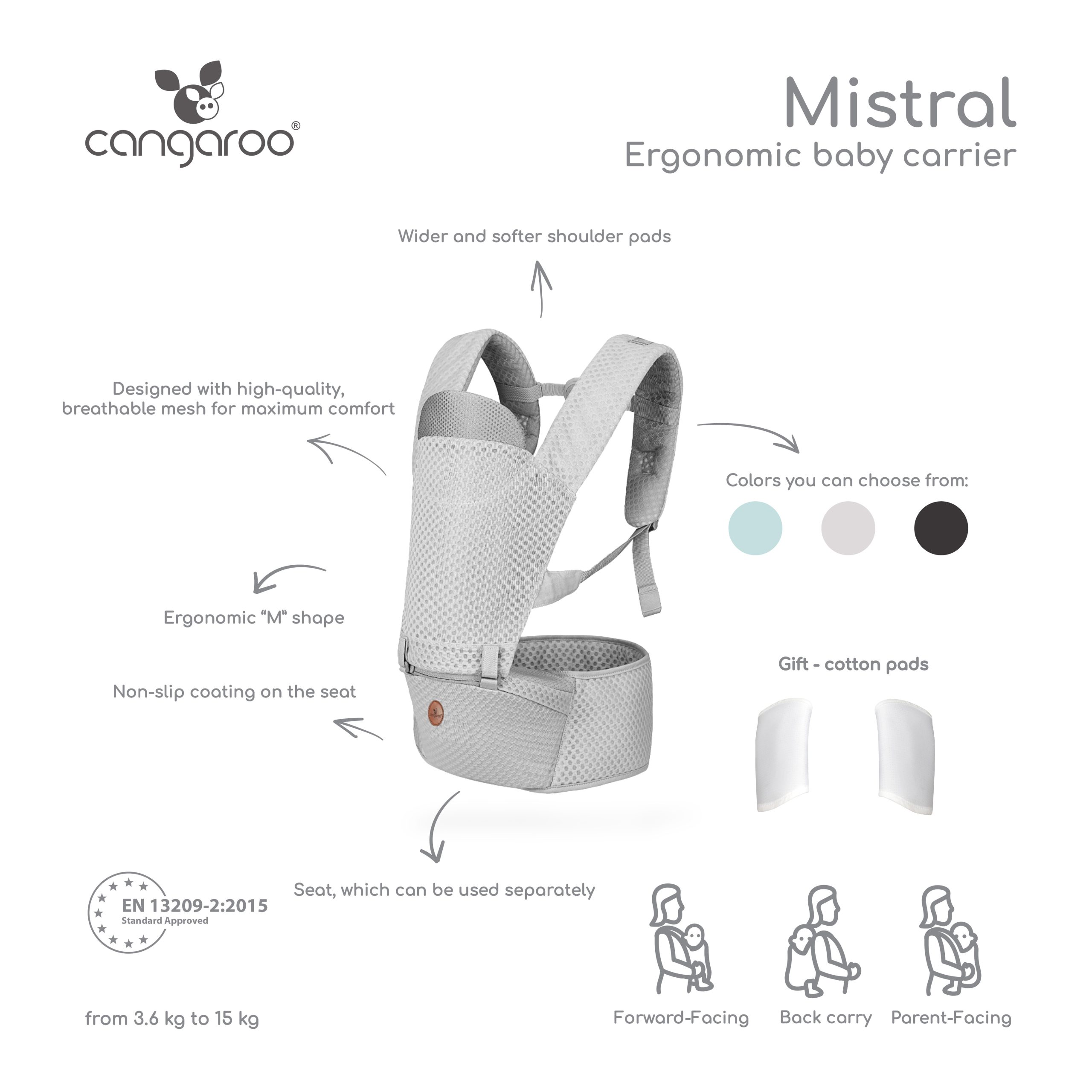 The ergonomic baby carrier with a base is suitable for children aged 5+ months up to 15 kg and can be used in three positions: facing the parent, facing forward, and on the parent`s back. It is made from mesh fabric, which facilitates air circulation, making it ideal for warmer months. The base has a non-slip surface and is additionally padded, absorbing vibrations during movement and providing an ergonomic M-shape for the legs. The base can also be used independently. The carrier includes a practical pocket for accessories. It is suitable for hand washing.
