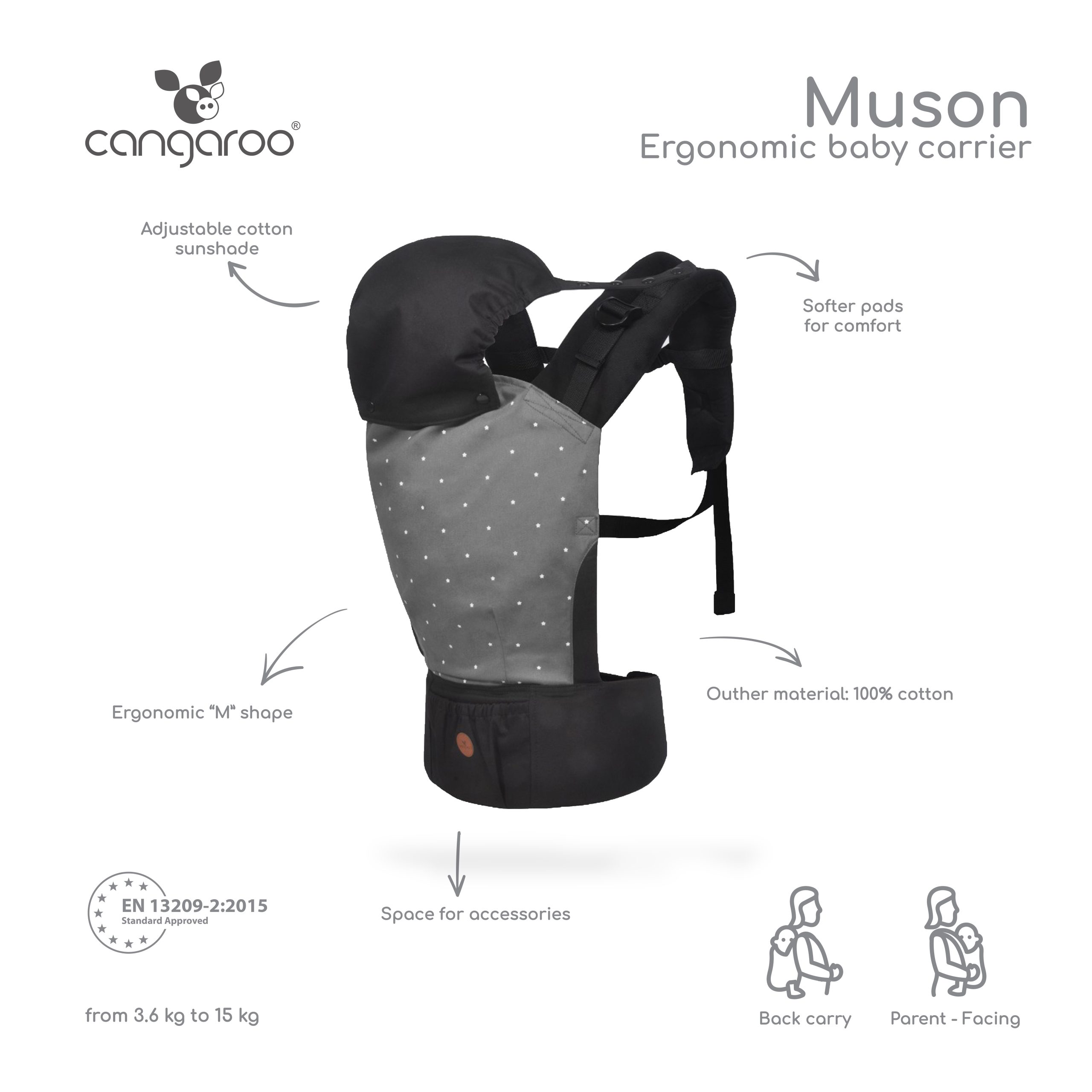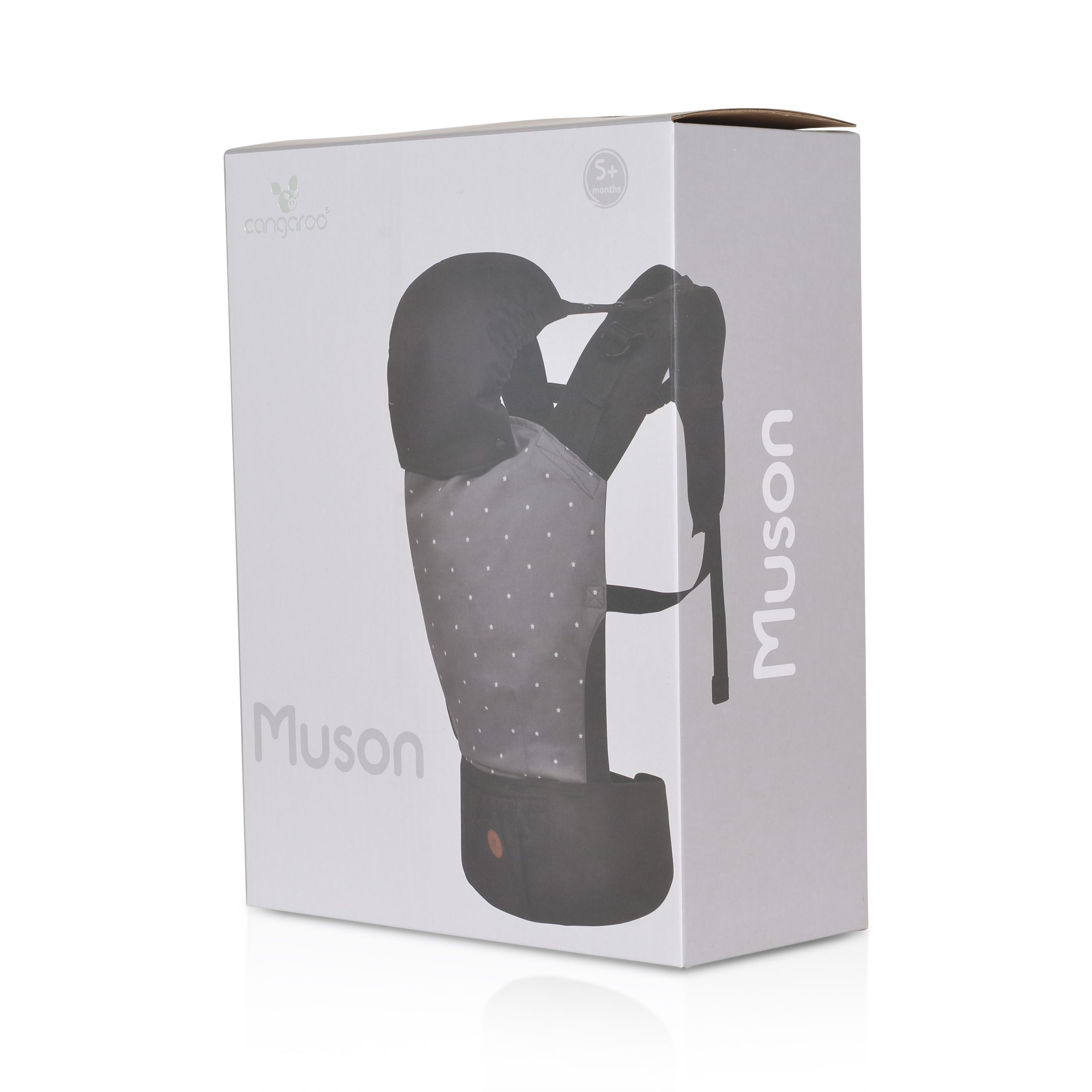 The Muson baby carrier is suitable for babies aged 5 months and up to 15 kg. The main parts and the hood are made of 100% cotton. It can be used in two positions – facing the parent or on the back. It features adjustable shoulder straps, a reinforced waist belt, and a double safety buckle for the baby`s security. A pocket for accessories and a detachable hood provide extra convenience and comfort. The product is easy to maintain and suitable for hand washing.