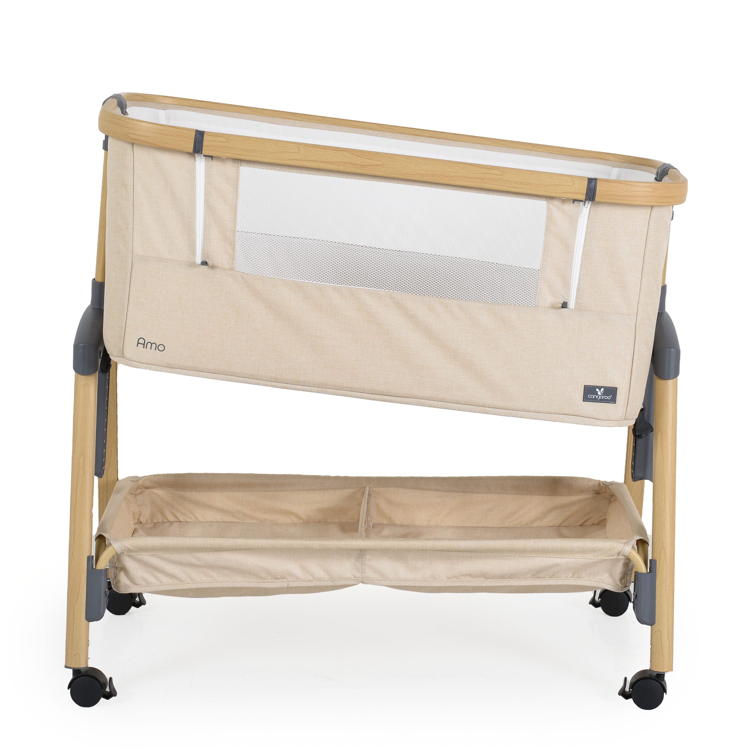Suitable for babies from 0 months. “Fixing up to parent`s bed“ function makes the first months nights much easier for the parent to be always next the new born baby. Suitable for every kind of bed with minimum height of 50 cm from the floor and maximum 80 cm. Height could be adjusted to one of 7 positions and option the crib to be tilted to an angle of 30° to help your baby`s digestion, improves breathing and manage reflux. There are 4 wheels with stoppers for easy movement. The super comfort mattress and soft sides keep your baby in a right position and keeps it safe. It can be used as a normal crib. There is a mosquito net and a basket for accessories.