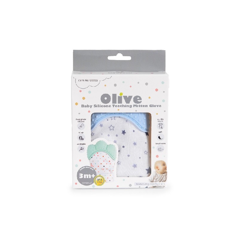 Silicone Teether Mitten “Olive” is intended for children from 3 months old. Made of Soft, breathable and gentle on the baby`s delicate skin fabric and soft silicone, without BPA. Helps relieve sore gums in teeth and protects the baby from self-scratching. With a noisy membrane to entertain the baby. Adjustable Velcro fastener to prevent slipping and dropping. Suitable for both hands depending on the baby`s preference. Easy to clean – manually and / or machine