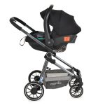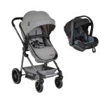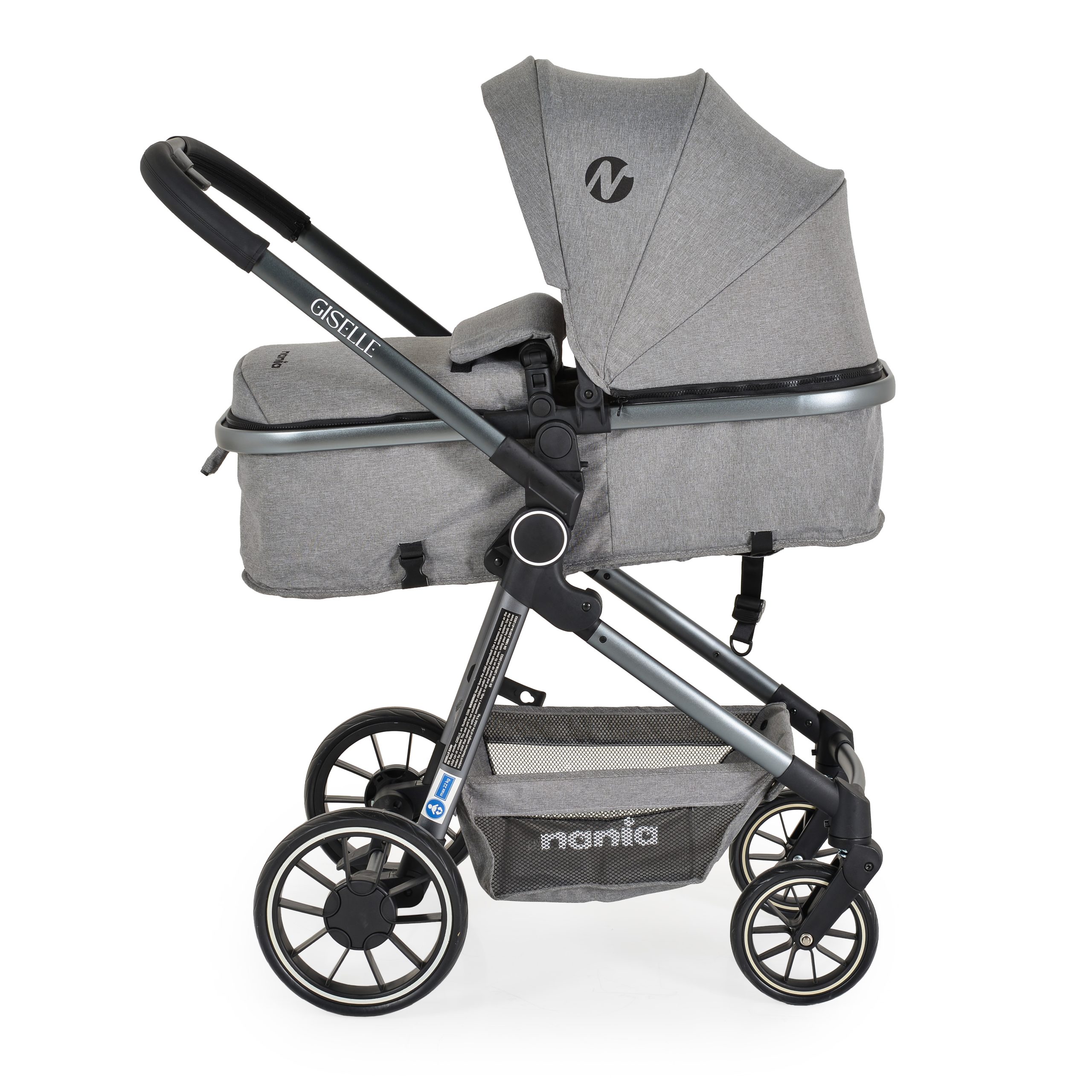 The Giselle 2-in-1 Stroller is suitable for children from birth up to 22 kg. It features a reversible seat with three reclining positions, compact folding, a 3-section canopy with a sun visor, and a 5-point safety harness. The zippered handle protectors make cleaning easier and improve hygiene. The front wheels rotate 360 degrees for easy maneuverability. The bumper bar is removable and comes with an additional zippered cover. Lightweight design – weighs only 6.9 kg. The set includes a foot cover, an infant car seat (40-87 cm), and car seat adapters.