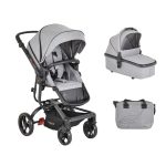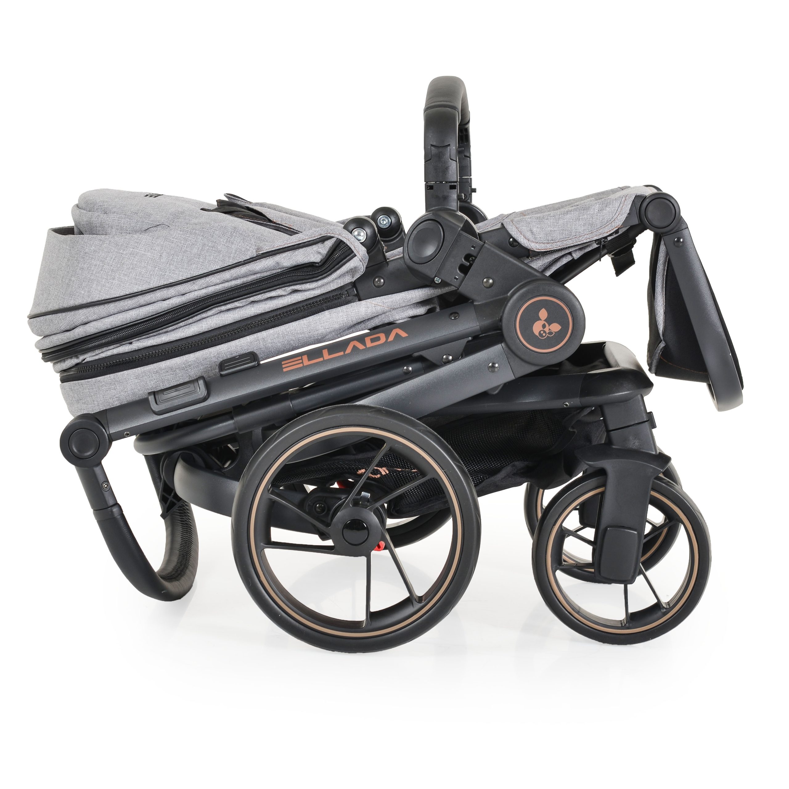 The Elada 2-in-1 baby stroller is suitable for children from 0 months up to 22 kg. It features a lightweight bassinet for newborns,only 3.8 kg, a soft mattress, and removable inner fabric. The stroller includes a reversible seat, adjustable backrest and footrest, as well as a canopy with a mesh window. The adjustable handle and detachable bumper bar are covered with PU leather for added comfort. The set includes a diaper bag with a changing mat and a foot cover.Compact folding, removable wheels – 7 inches in the front and 10 inches in the back, with shock absorbers for a smooth ride on any terrain. A 5-point harness with soft pads ensures safety, and there is a spacious basket for accessories. It is compatible with the Elada car seat, not included in the set.