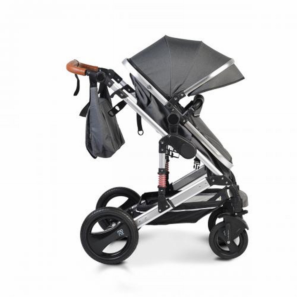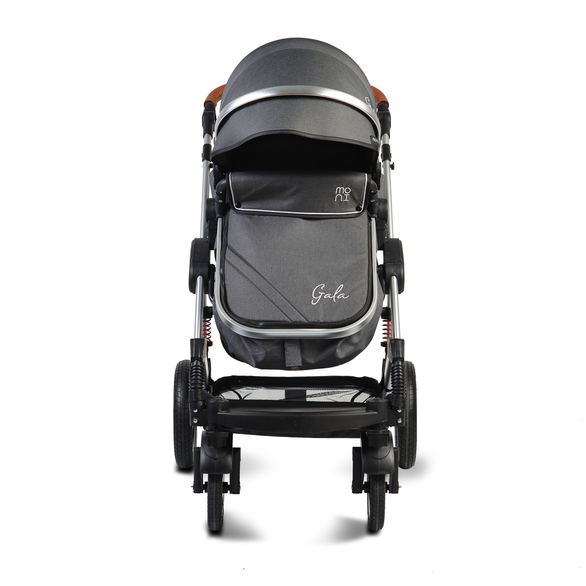 The baby stroller is with aluminum frame and rear, front and middle suspensions. Can be transformed into carry cot for newborn up to 6 months and into seat for children aged 6 to 36 months. Five-point harness system with soft shoulder pads. The back of the seat has three positions – sitting, semi-lying and lying. The position of the backrest is adjustable through belt. The stroller canopy has an additional visor. The bumper bar is with sewn leather and is detachable. One-touch braking system with instant braking. Handle bar it has got handmade sewn PU leather. The handle`s height adjusted by buttons and the footrest`s height by belt. The stroller is folded and unfolded easily and quickly. With mama bag, cup holder and mosquito net. For better convenience of the child in the product is included and additional pad for the seat.
