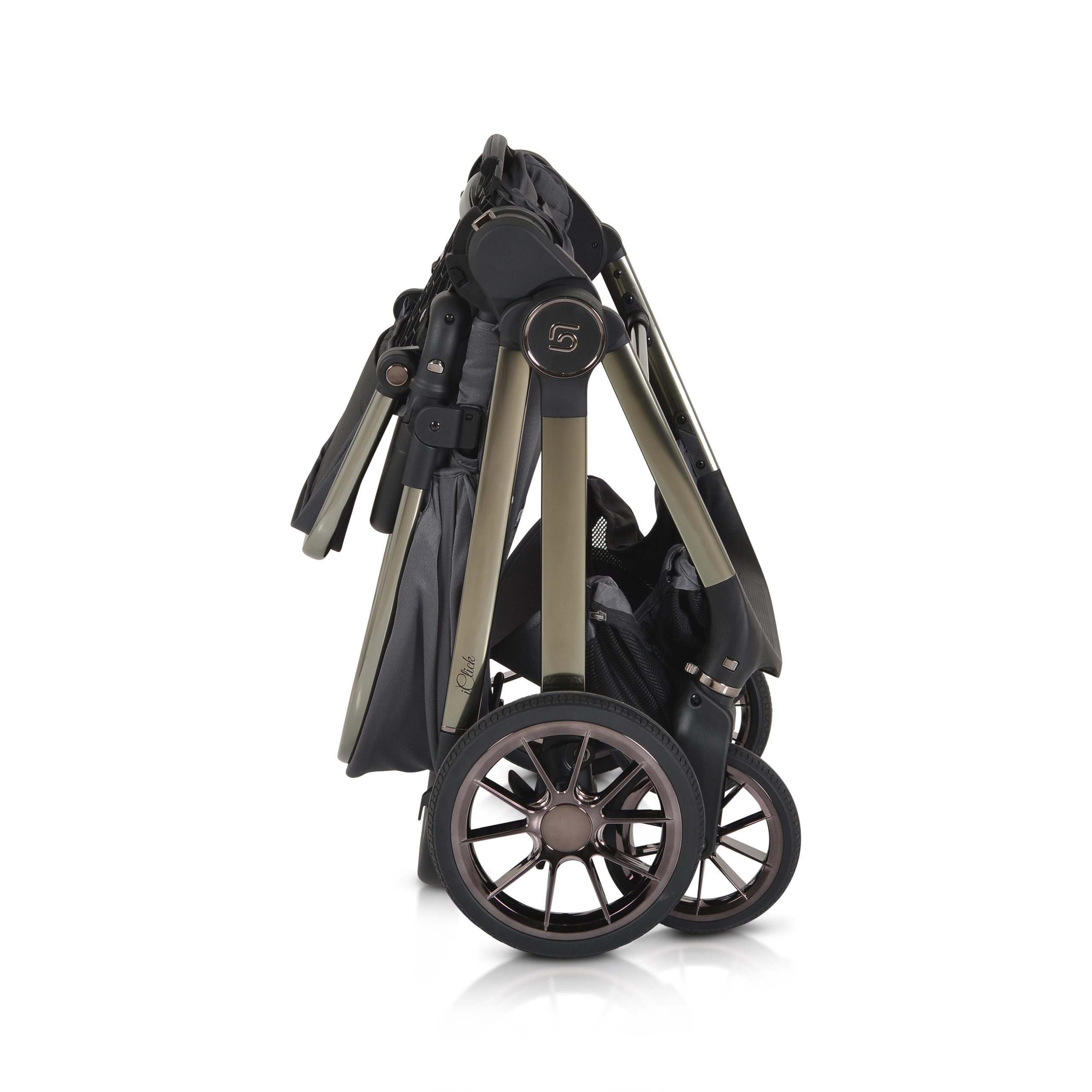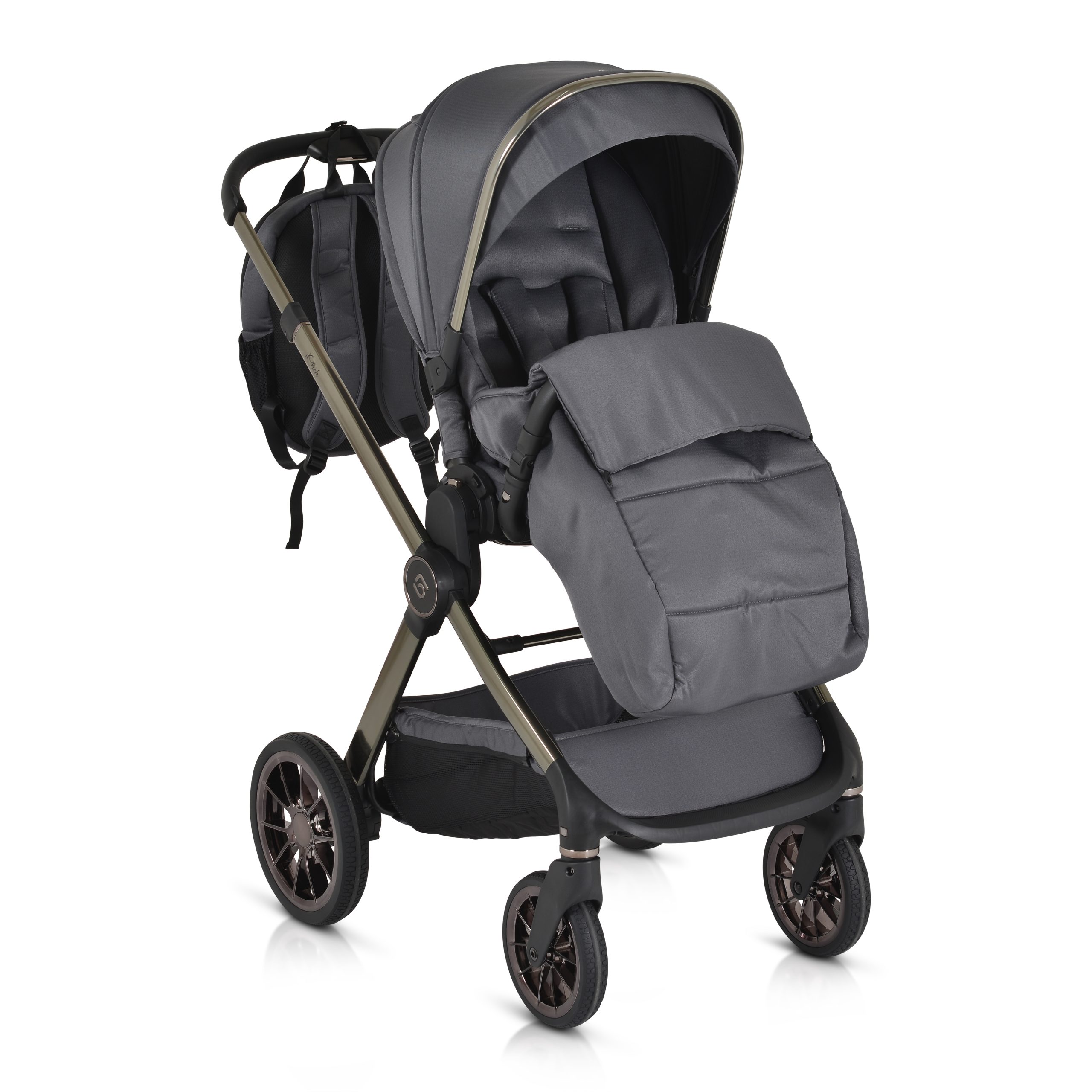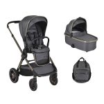 Suitable from birth to 22 kg, this stroller features a lightweight aluminum frame with durable PVD coating for wear and scratch resistance. The front wheels rotate 360° with a locking mechanism and easy disassembly, while high-quality PU tires and shock absorbers on all wheels ensure a smooth ride. The rear brake is connected and operated with one touch, and the shopping basket holds up to 3 kg with easy access. The reversible seat folds automatically in both directions and includes a 5-point safety belt with magnetic clasp and soft pads, a removable leather safety bar, adjustable backrest (3 positions), and footrest (3 positions). The handle adjusts to 5 heights and is covered in leather. The canopy has 3 sections, an additional visor, and a magnetic closure window for child monitoring. The high-quality fabric, extra padding, and adjustable shoulder straps (3 heights) enhance comfort. The newborn bassinet features an anti-colic system (3 positions), adjustable height with adapters, a folding system for easy transport, and a canopy with 4 sections and a mesh window. Accessories include a foot cover with magnetic closure, rain cover, luxury mosquito net, changing pad, adapters for the bassinet and car seat, and a luggage bag/backpack. Compatible with the Onyx car seat and Rotex base (not included in the package).