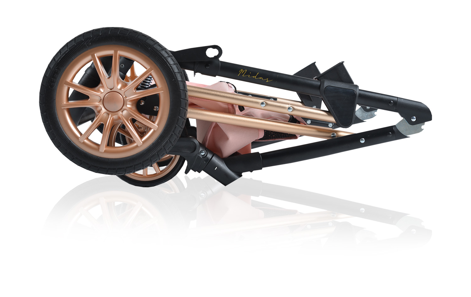 Baby stroller Midas features a lightweight aluminum frame and can be converted into a carrycot for newborns up to 6 months or a seat for children aged 6 to 36 months. It has a height-adjustable handlebar, a three-position recline seat, and a two-position adjustable footrest. The foot cover is included. The stroller is equipped with a five-point harness system with soft shoulder pads, an adjustable and detachable bumper bar, a one-touch brake, and a large storage basket. It folds quickly and compactly. Accessories included: 2 sleeping pads, foot cover, and mama bag. Compatible with the Car Seat Trio 40-86 cm and the Baby Car Seat Base Royal 40-87 cm, both sold separately.