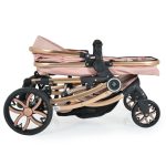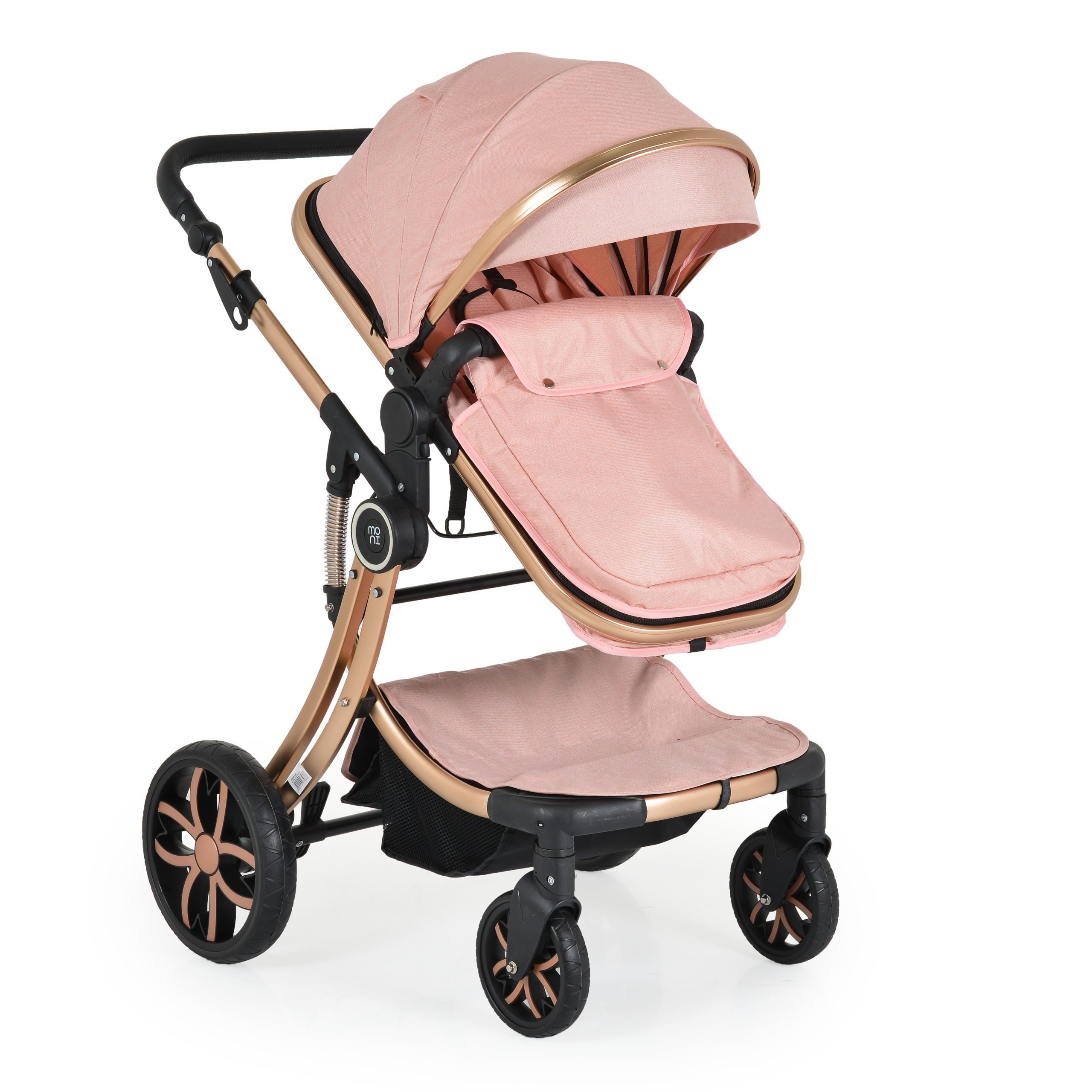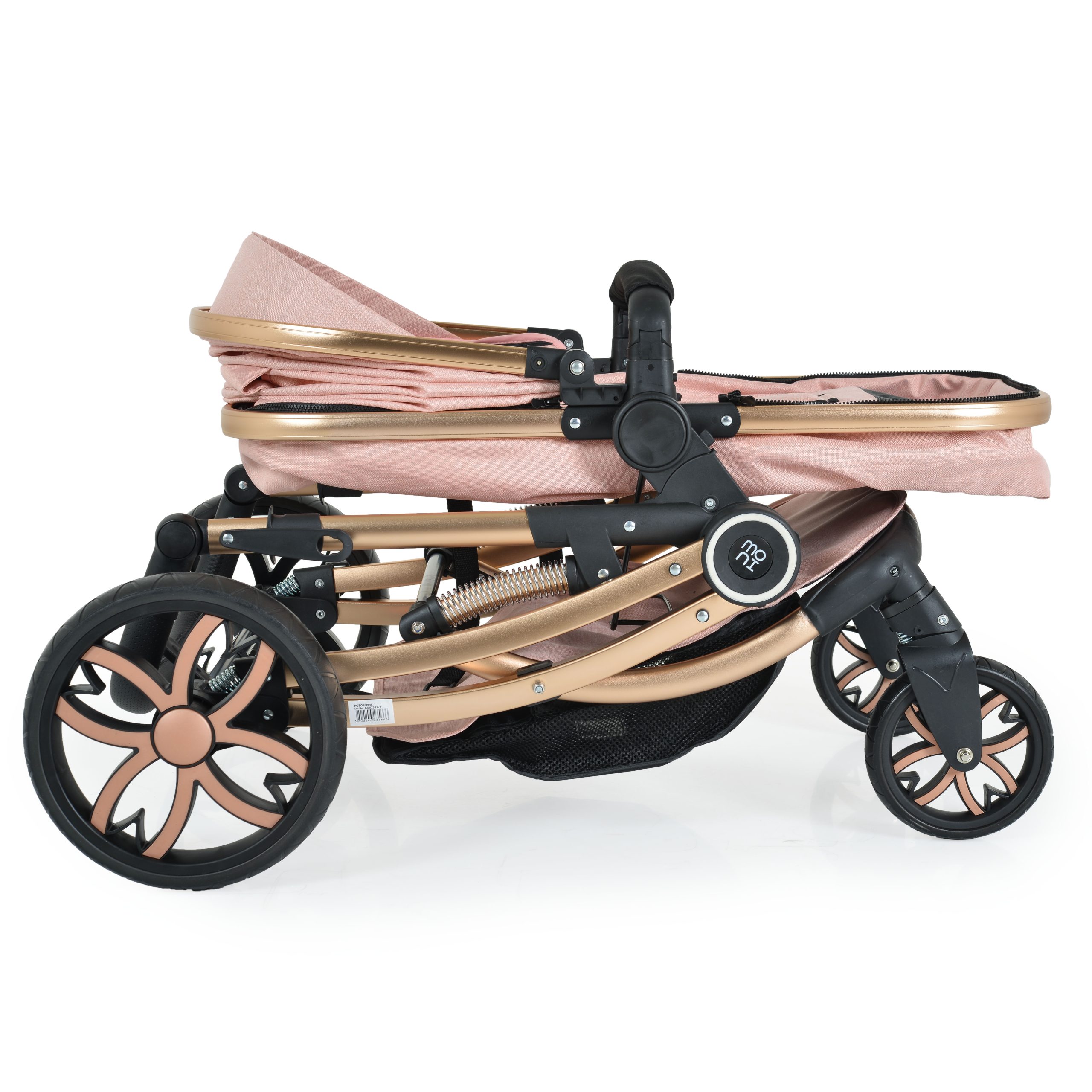 Suitable for babies from 0+ months up to 15 kg. The above price is for the stroller with carry cot, summer seat and bag for accessories. The car seat is not included in the price. The carry cot is with foot cover, soft sleeping pad, adjustable canopy with mosquito net. The summer seat is with foot cover, sleeping pad, adjustable canopy with window, 5-point safety belt, adjustable PU leather handle bar, big accessory basket and adjustable bumper bar. The car seat is with foot cover, canopy and sleeping pad. The frame of the stroller is aluminum; front wheels are with special shock-absorbing system for All-terrain.