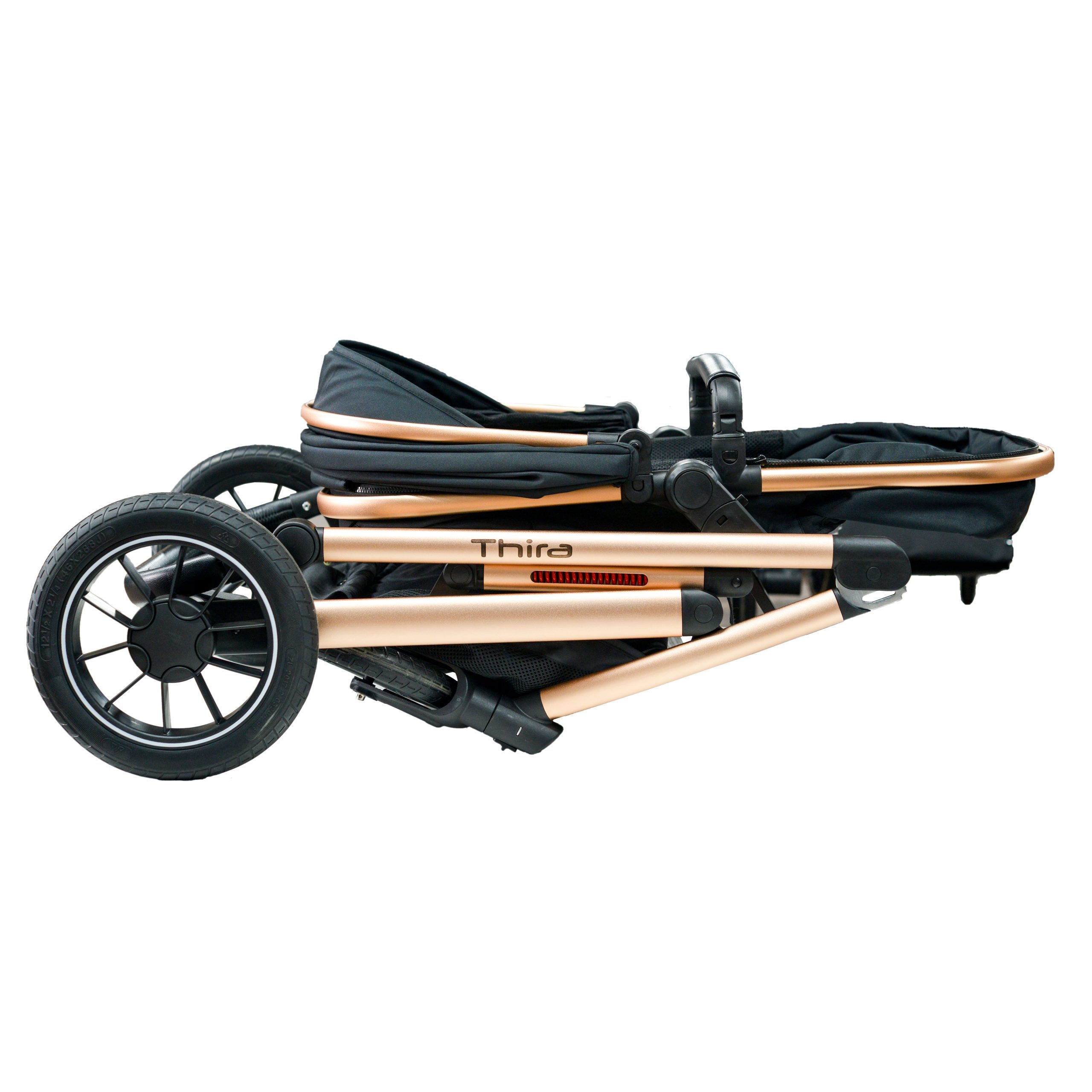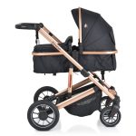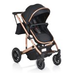 The baby stroller is with aluminium frame. Can be transformed into carry cot for new born up to 6 months and into seat for children aged 6 to 48 months. Five-point harness system with soft shoulder pads. The back of the seat has three positions – sitting, semi-lying and lying. The position of the backrest is adjustable through belt. The stroller canopy has an additional visor. The bumper bar is detachable. One-touch braking system with instant braking. The handle`s height adjusted by buttons and the footrest`s height by belt. The stroller is folded and unfolded easily and quickly. With mama bag.