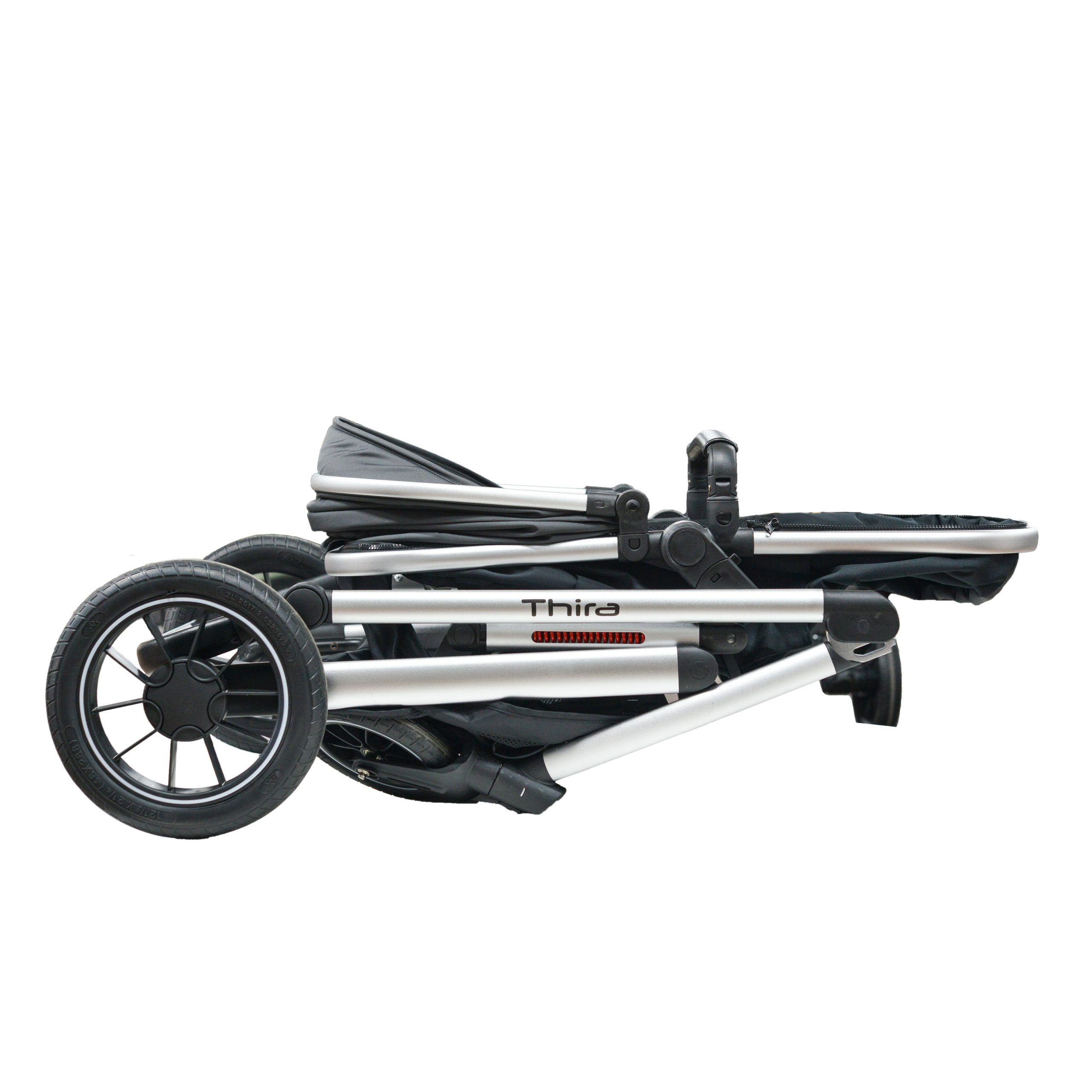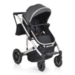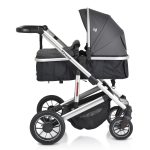 The baby stroller is with aluminium frame. Can be transformed into carry cot for new born up to 6 months and into seat for children aged 6 to 48 months. Five-point harness system with soft shoulder pads. The back of the seat has three positions – sitting, semi-lying and lying. The position of the backrest is adjustable through belt. The stroller canopy has an additional visor. The bumper bar is detachable. One-touch braking system with instant braking. The handle`s height adjusted by buttons and the footrest`s height by belt. The stroller is folded and unfolded easily and quickly. With mama bag.