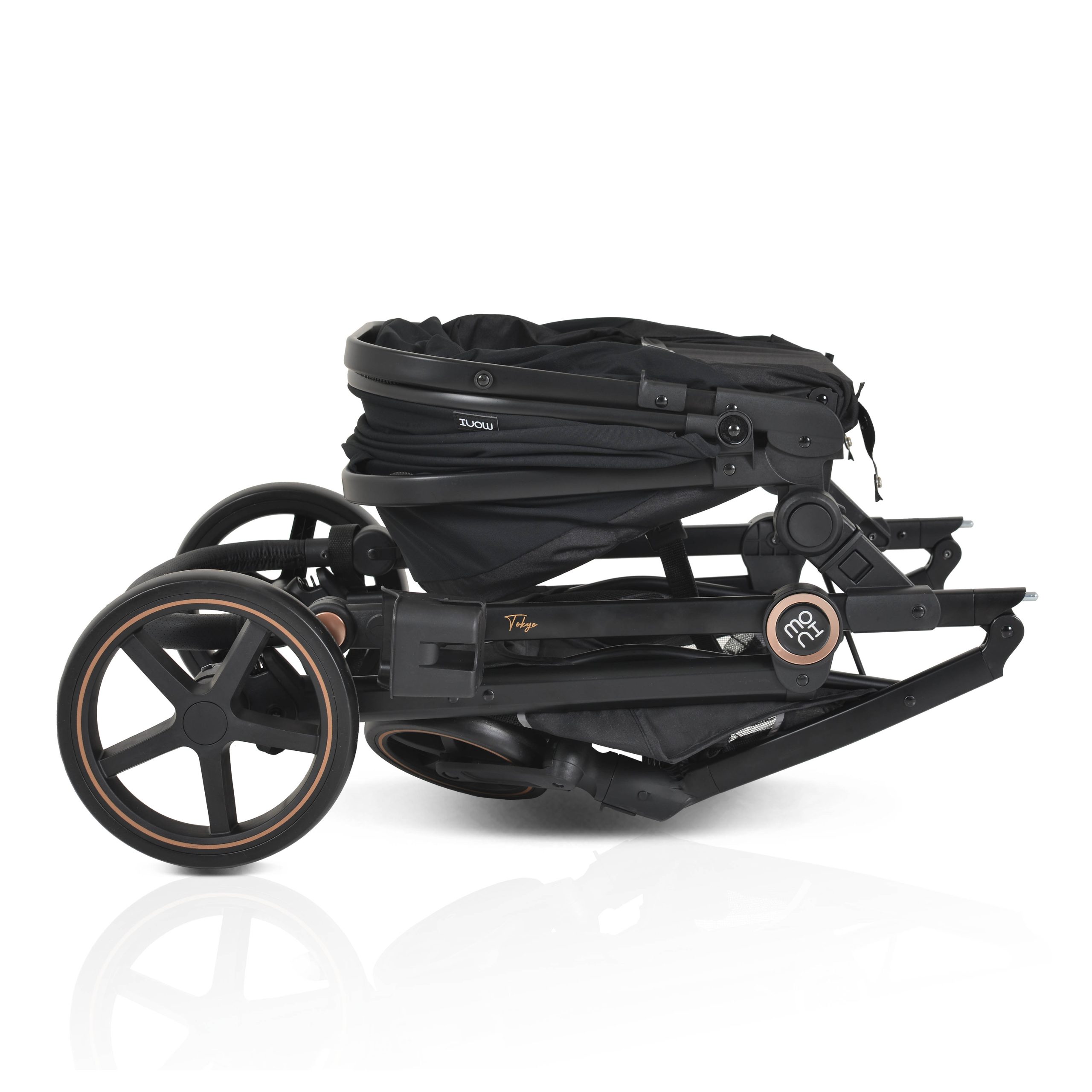 Baby Stroller Tokyo is suitable for newborns and children weighing up to 22 kg. It features an ultra-lightweight frame and a seat unit that easily transforms into a carrycot for newborn use. The seat can be installed in both directions – parent-facing or forward-facing – and has three reclining positions for maximum comfort. It includes a removable bumper bar made of high-quality eco leather and a 5-point safety harness with soft shoulder pads. The large adjustable canopy features a window for observing the child. The ergonomic handle is covered with premium eco leather for a comfortable grip. The spacious under-seat basket provides convenient storage. All wheels are equipped with shock absorbers and can be removed with a single motion. The rear wheels have a linked brake for added safety. The stroller can be folded together with the seat attached. Included accessories: foot cover, mama bag, and mosquito net. Car seat adapters are included. The stroller complies with European safety standards EN1888-1 and EN1888-2. Compatible with the Car Seat Multi 40-86 cm and the Baby Car Seat Base Royal 40-87 cm, both sold separately.