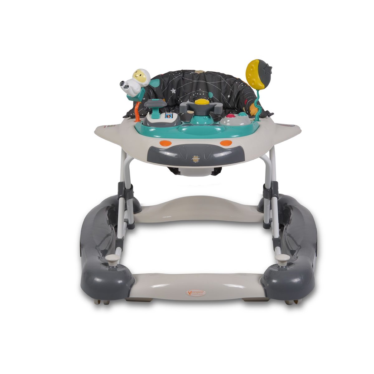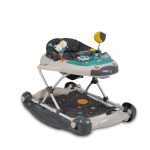 Walker 3in1. Height adjustment in 3 positions; High – 22.7 cm, Mid – 21.2 cm , Low – 19.5 cm ; Removable music toy bar with 12 melodies; Lighting effects that attract the child`s attention. 2 front wheels, rotating 360 degrees; 2 rear silicone wheels with rectilinear motion; 6 silicone stoppers for under the base, for greater security; Soft seat with high back; High quality plastic material; The walker becomes a swing.