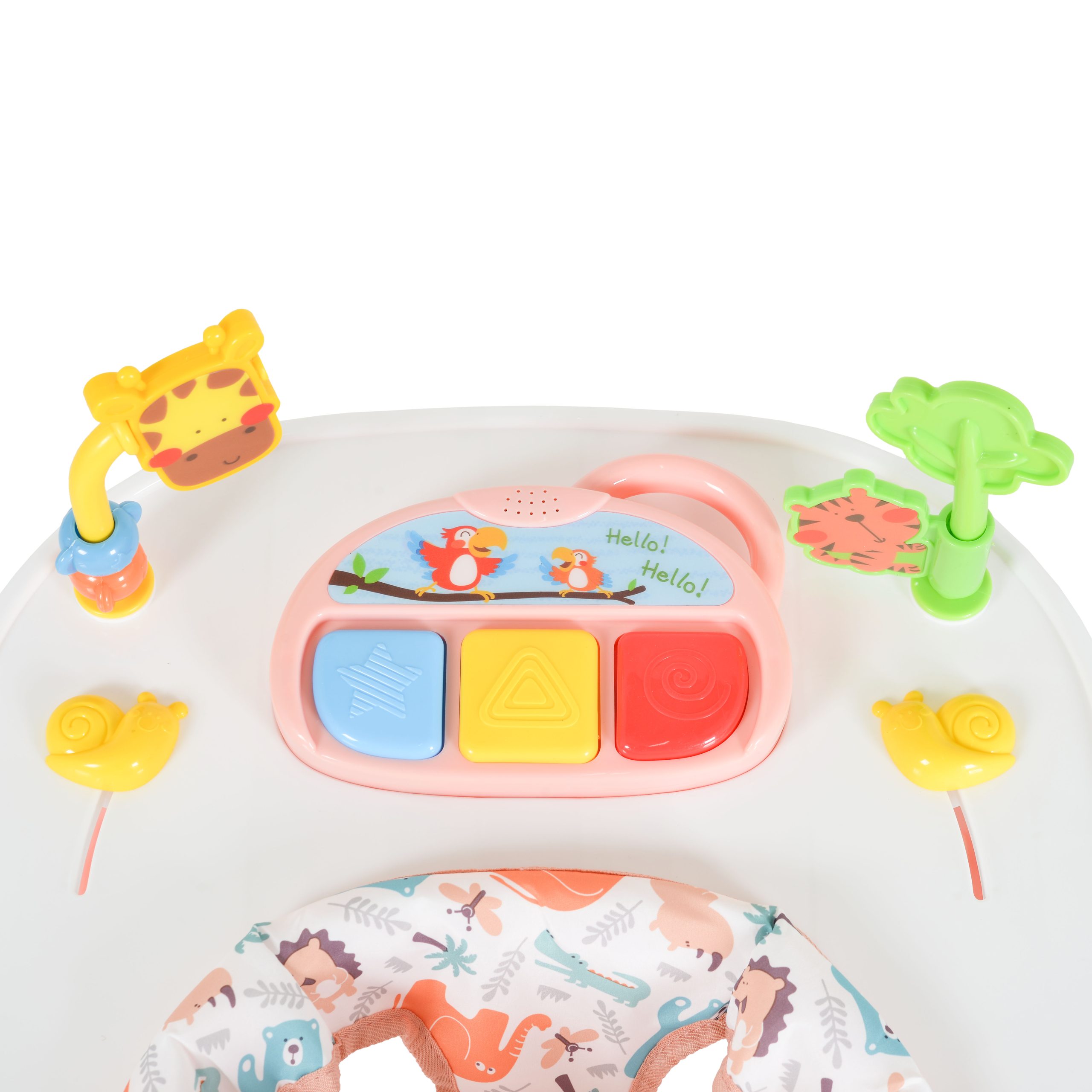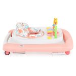 For children above 6 months of age. The rear part of the base can be removed and the product to be used as push walker. Music tray with toys and music functions. 3 levels of height adjustment depending on the child`s height. Soft seat. 2 front swivel wheels. 2 rear wheels. Silicone stoppers