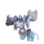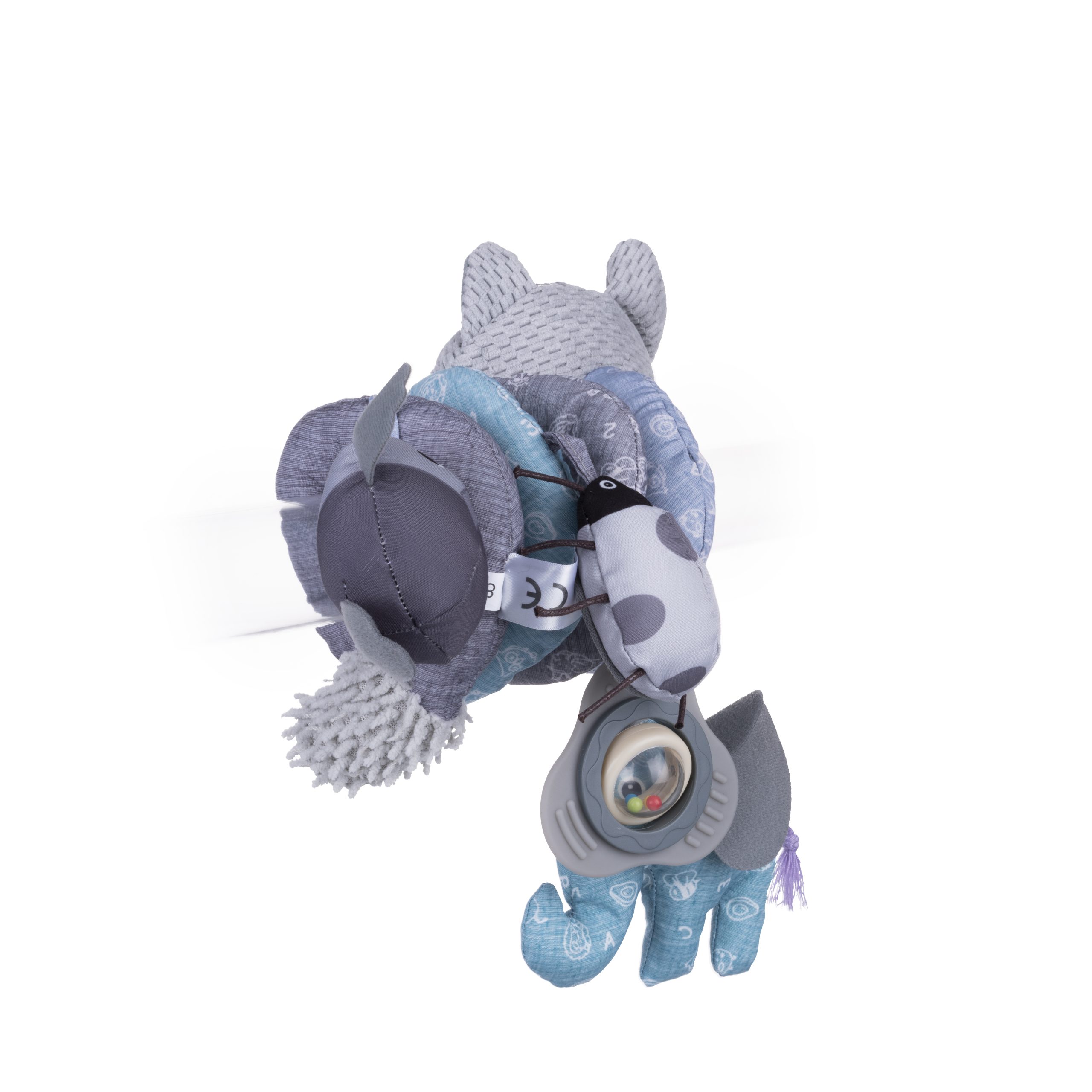 Plush toy to attach to the board of the baby carriage or crib. Its fur is made of different materials with different textures that stimulate the baby`s sense of touch. The foxes are decorated with 4 pendants for even more fun: a rattle elephant, a soft rattle with rattle beads, a ladybug with a safety mirror and a squeaky bat. The whole merry band is decorated in neutral colors, making this multifunctional spiral a stylish addition to children`s furniture.