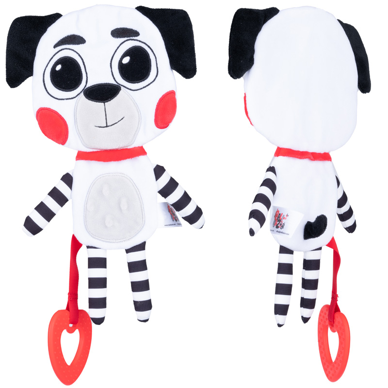 A cute dog made for cuddling. Its body rustles charmingly, and the varied textures of the materials from which it is made support the development of the child`s cognitive abilities. The toy is decorated with a soft teether with protrusions that will provide relief during teething. The expressive, contrasting colors of the animal stimulate the baby`s sense of sight from the first days of his life.