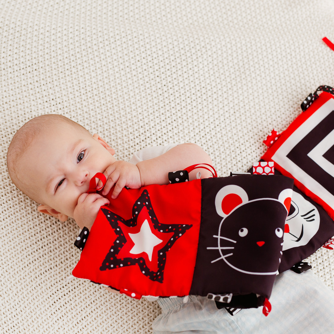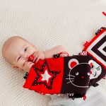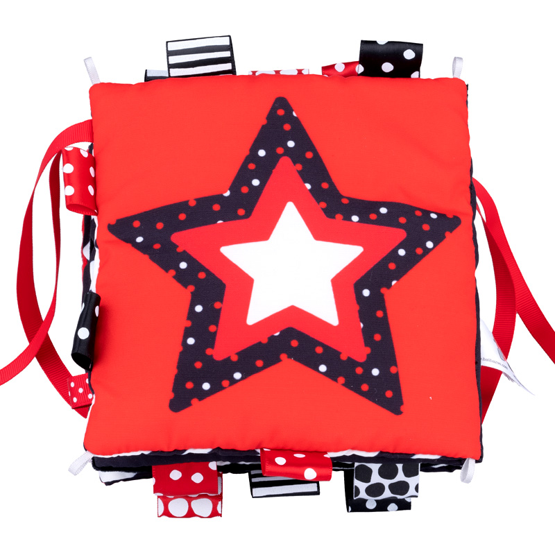 Baby`s first book made entirely of materials with different textures. It contains pictures and colorful labels that are sure to interest your baby. The booklet is part of the sensory series designed for visual stimulation of the baby at an early age. This series is more special because the black and white contrast images are the easiest to recognize from the newborn.