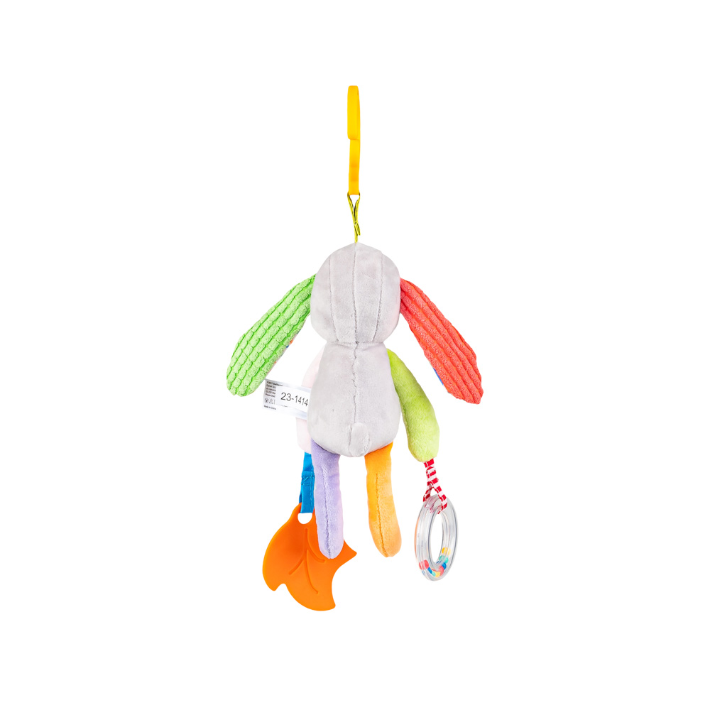 The compact bunny will be the perfect companion for your first walks. The toy is made of materials with a variety of patterns and textures, thanks to which it stimulates the senses of the young child, encouraging him to explore the world through sensory means. Two additional toys are attached to the bunny`s paws: a soft teether and a rattling beaded ring. The small size of the pendant will allow you to always carry it with you so that it can cheer up your little one everywhere. The practical handle with which the toy is equipped allows it to be easily attached anywhere.