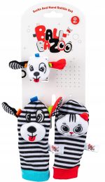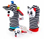A jingling team of cuties will cheer up your baby and charm him with cheerful sounds! The set includes two socks and a bracelet decorated with animal heads. They are made of materials in contrasting colors and different textures, thus stimulating the baby`s senses, encouraging him to explore the world through his senses. The set can be used both as a set and each element separately, choosing the rattle that the baby is most interested in at any given time. The product is intended for children from birth.