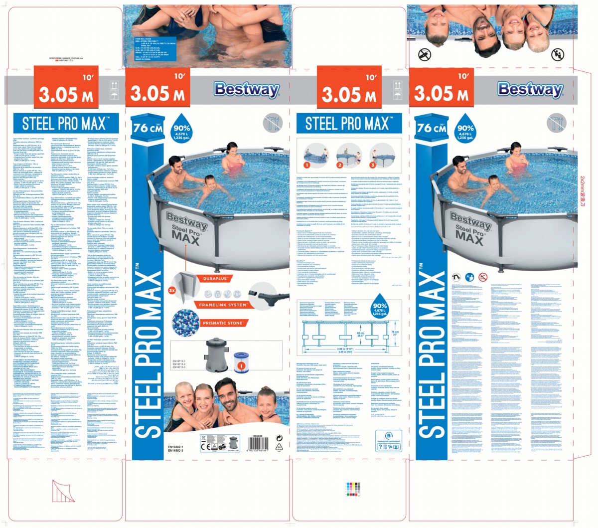 Framed pool easy to assemble in 20 minutes and very affordable, with a strong steel frame. Made of DuraPlus™ material (enhanced 3-layer puncture resistant liner). Maximum water level up to 68 cm. Hose diameter 3.2cm. FrameLink System™ is simple to set up and ensures strength and durable frame connection with protective coating. There is drain valve. Dimension of the assembled pool width 305cm x 305cm x 76cm (inner height 68cm). Shape: Round; Water capacity: 4 678l; Package contains one frames pool, Filter pump
