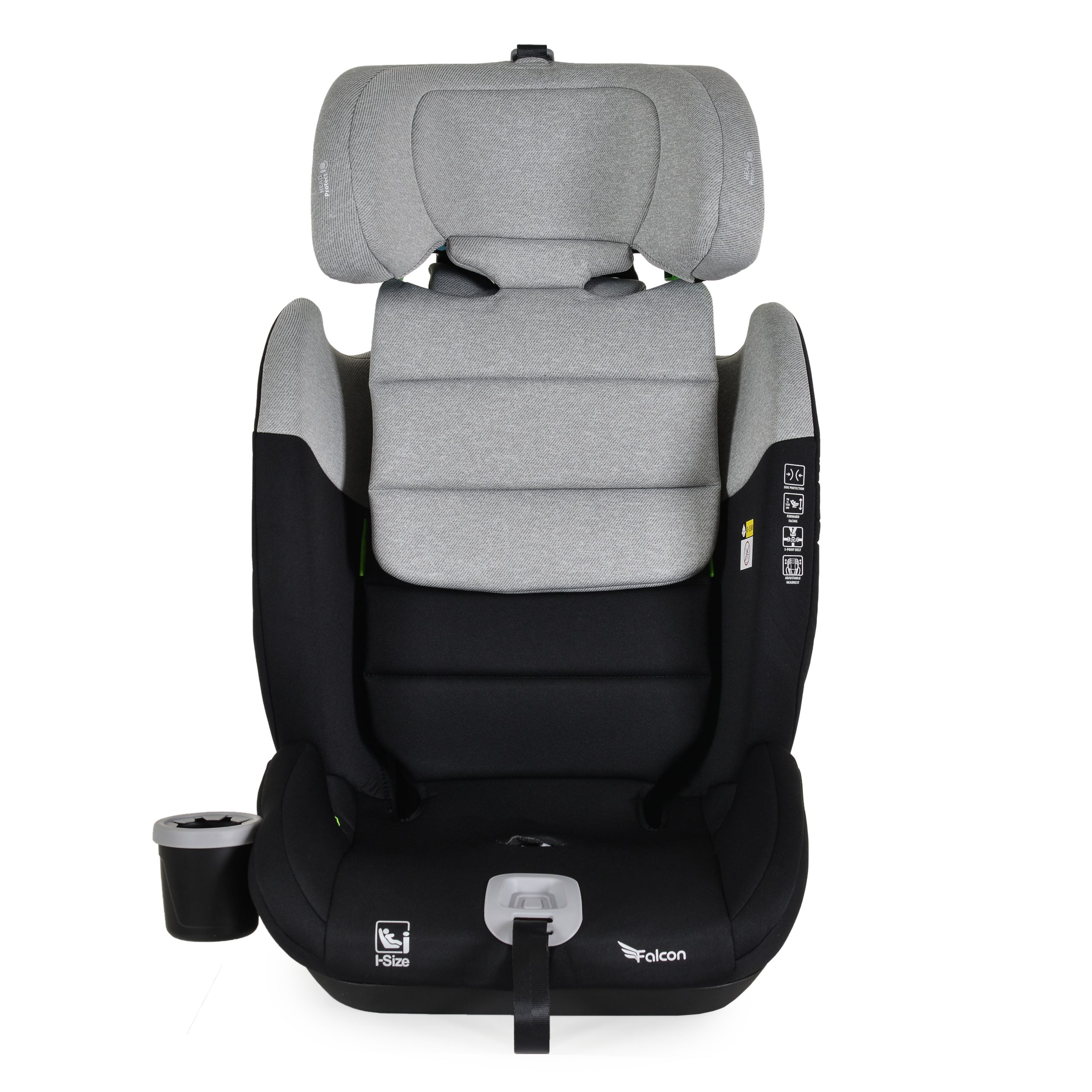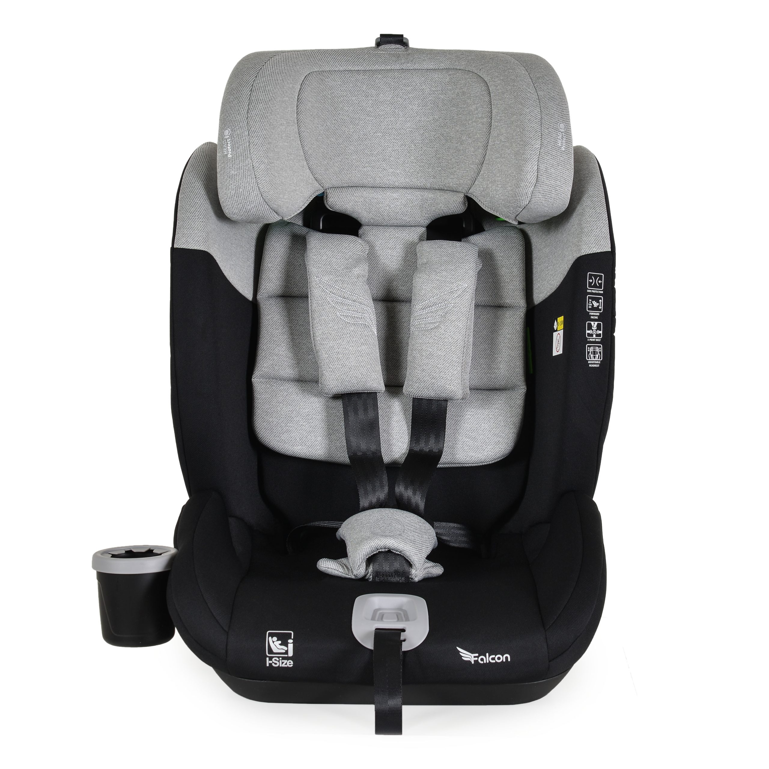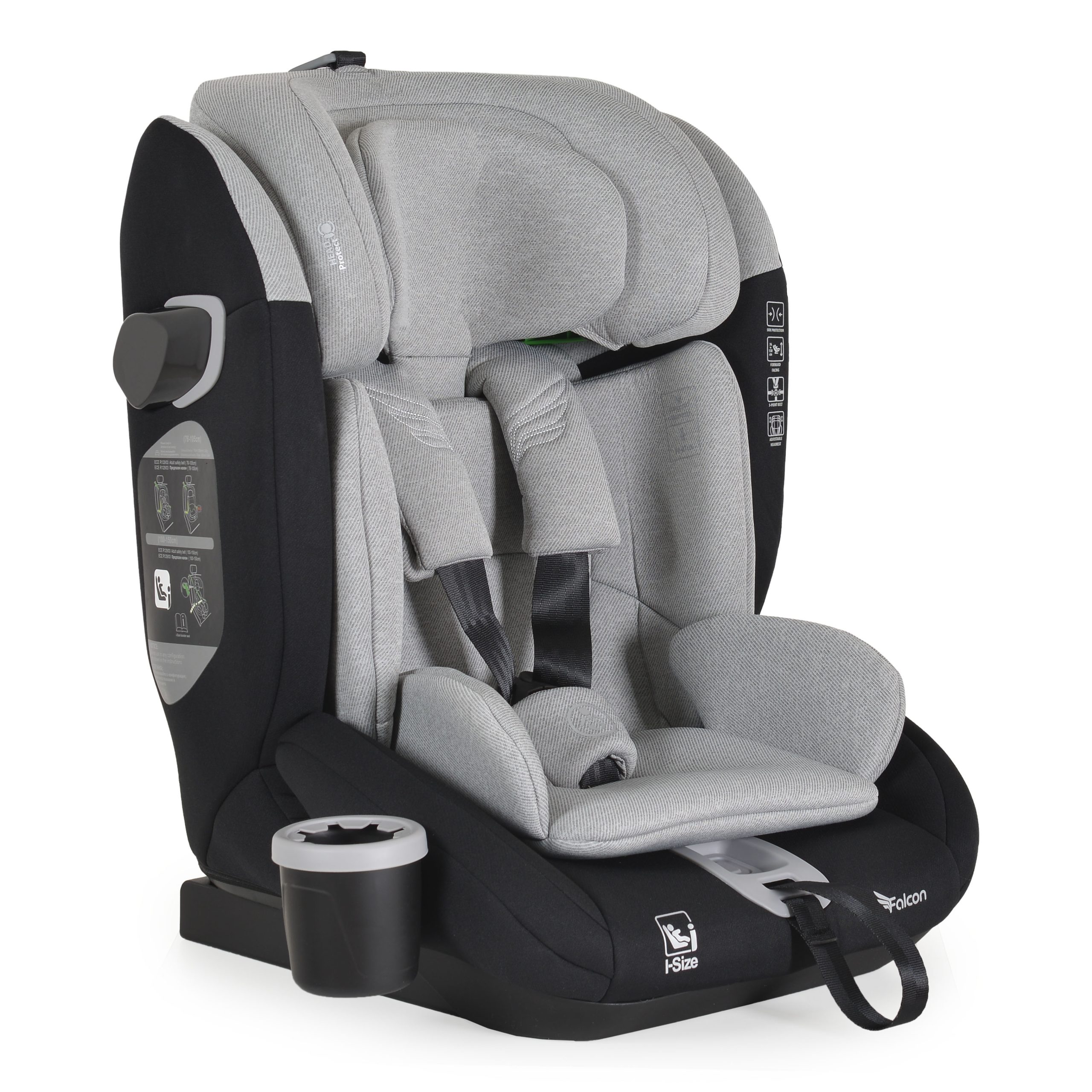 The Falcon car seat is designed for children with a height from 76-150 cm. The main parts of the seat are precisely and accurately manufactured through an injection molding process, which makes it much more secure and durable compared to other products. 5-point safety harness with soft padding and Anti Slip protective pads. SPS – Side Protection System for additional protection in the event of a collision. The headrest is made of memory foam. The seat adjusts according to your child`s height in 9 positions. The seat cover is easily removable, making cleaning and maintenance easy. Included is an additional soft cushion. Cup or bottle holder with spill-proof system and soft silicone seal. The car seat is developed and tested according to the latest EU regulation R129/03 I-Size (76-150 cm).