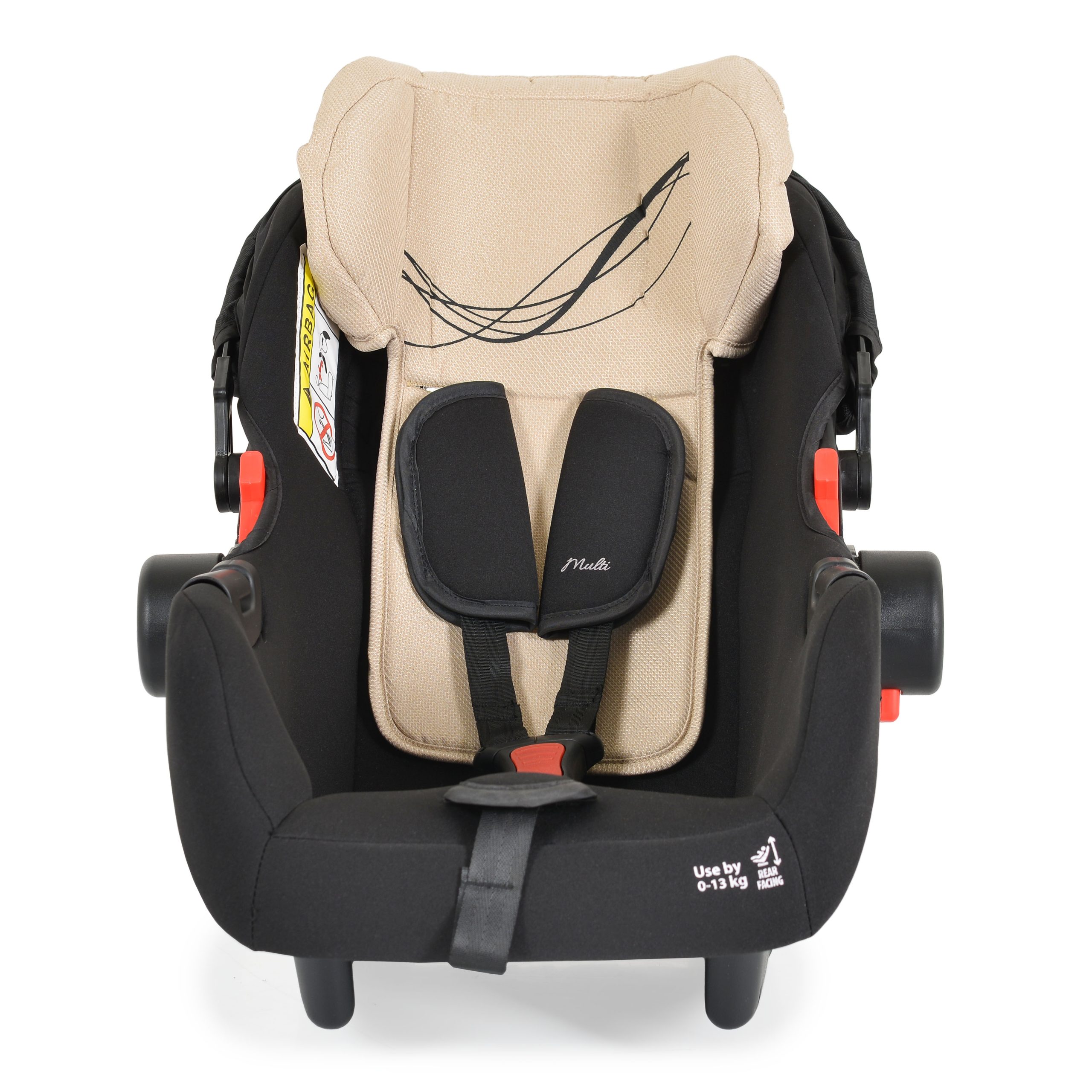 The Multi car seat is suitable for rear-facing use for children from 40 to 86 cm in height. It features an adjustable ergonomic handle and a memory foam headrest with multiple positions for optimal comfort. The seat includes an adjustable canopy and three-position height-adjustable belts. Safety is ensured by a 5-point harness with soft shoulder pads and a cover for the lower buckle. The belts are adjustable, and the seat also has a soft, comfortable pillow for added child comfort. The upholstery is removable and easy to clean. Tested according to the ECE R129/03. For added convenience, the seat is compatible with Kali, Tokyo, Rio, and Rafaello strollers. It is also compatible with the Royal 40-87 cm car seat base, which is recommended for enhanced safety and easy installation.