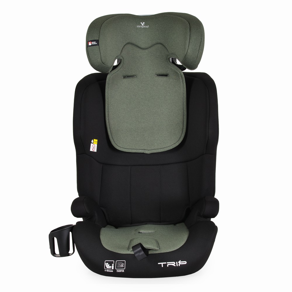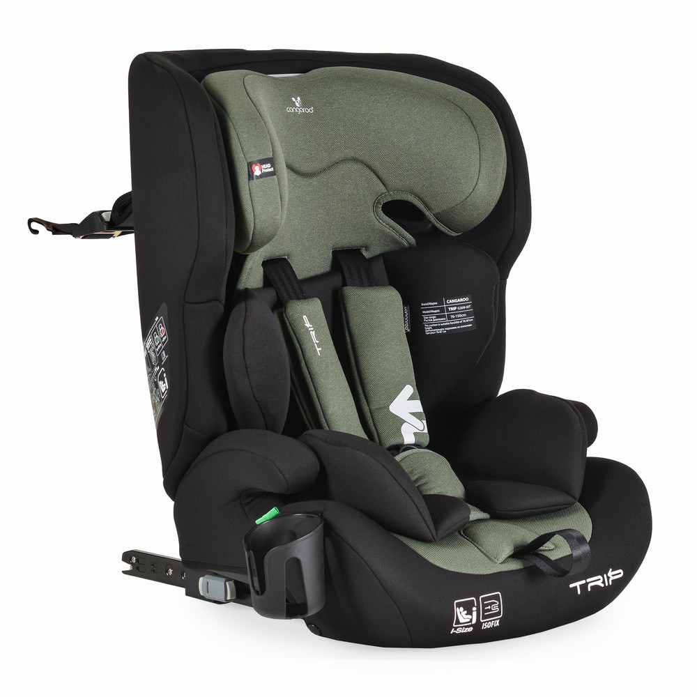 Car Seat Trip by Cangaroo (76–150 cm, i-Size), certified according to ECE R129/03, is a practical and safe solution for children measuring 76 to 150 cm. Installation: for children 76–105 cm – forward-facing with Isofix, Top Tether, and a 5-point safety harness; for children 100–150 cm – with a 3-point vehicle belt and Isofix. Key features: 5-point harness with soft padding and Anti-Slip silicone pads; Isofix + Top Tether – a secure three-point installation system providing stability and protection in a collision; adjustable headrest with 11 positions that grow with the child; removable cover for easy cleaning; cup or bottle holder.