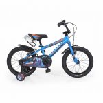 Children bicycle 16“ steel frame. Alloy wheels. Alloy stem. Front and rear V-brake. Plastic mudguards and chainwheel guard . Sidewheels. Bell. Suitable for children from 4 to 6 years old, with max weight up to 30 kg