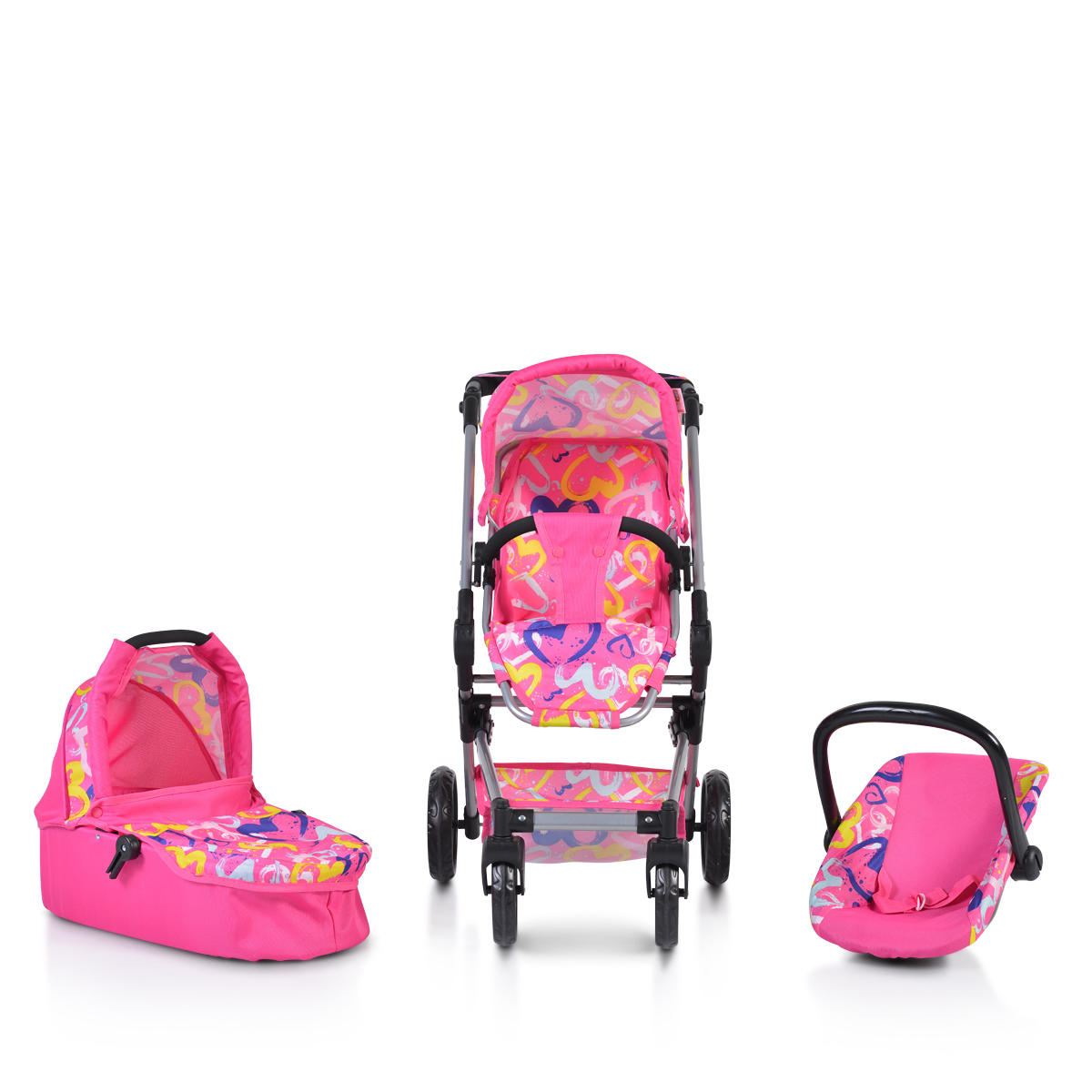 Suitable for children over 3 years. The doll pram includes carry cot, summer seat, car seat and bag for accessories. The push handle is adjustable.