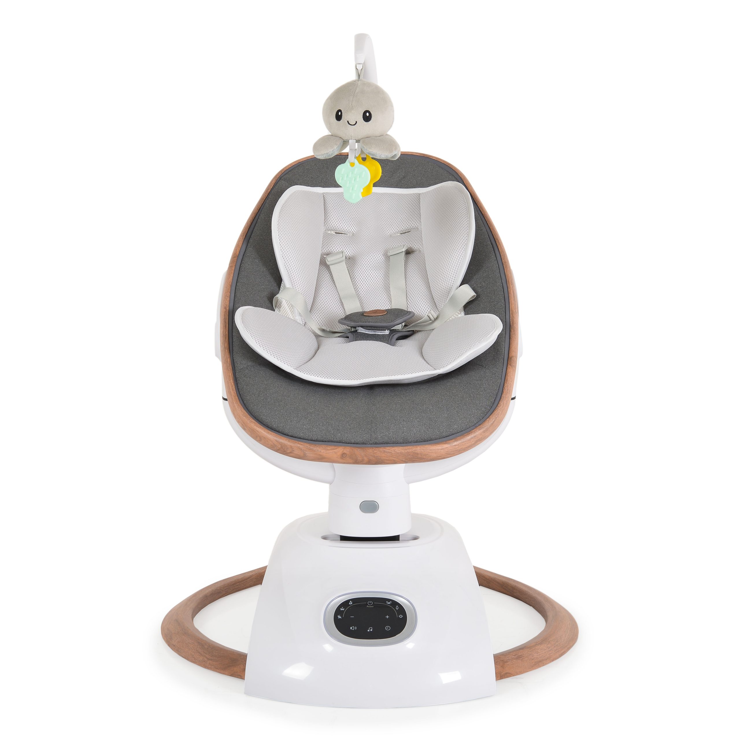Baby swing Triumph is a high-quality item, packed in beautiful colour box. The swing has 6 modes, 5 levels of speed, 4 timer options and 13 melodies with volume control. The seat has 3 positions of adjustment and 90-degrees rotation. The design is clear and stylish with its wooden print and touch screen display. The toy bar is with interactive toy. The belt is 5-pointed. The swing works with adaptor, which is included in the set, and with a remote control, also included.