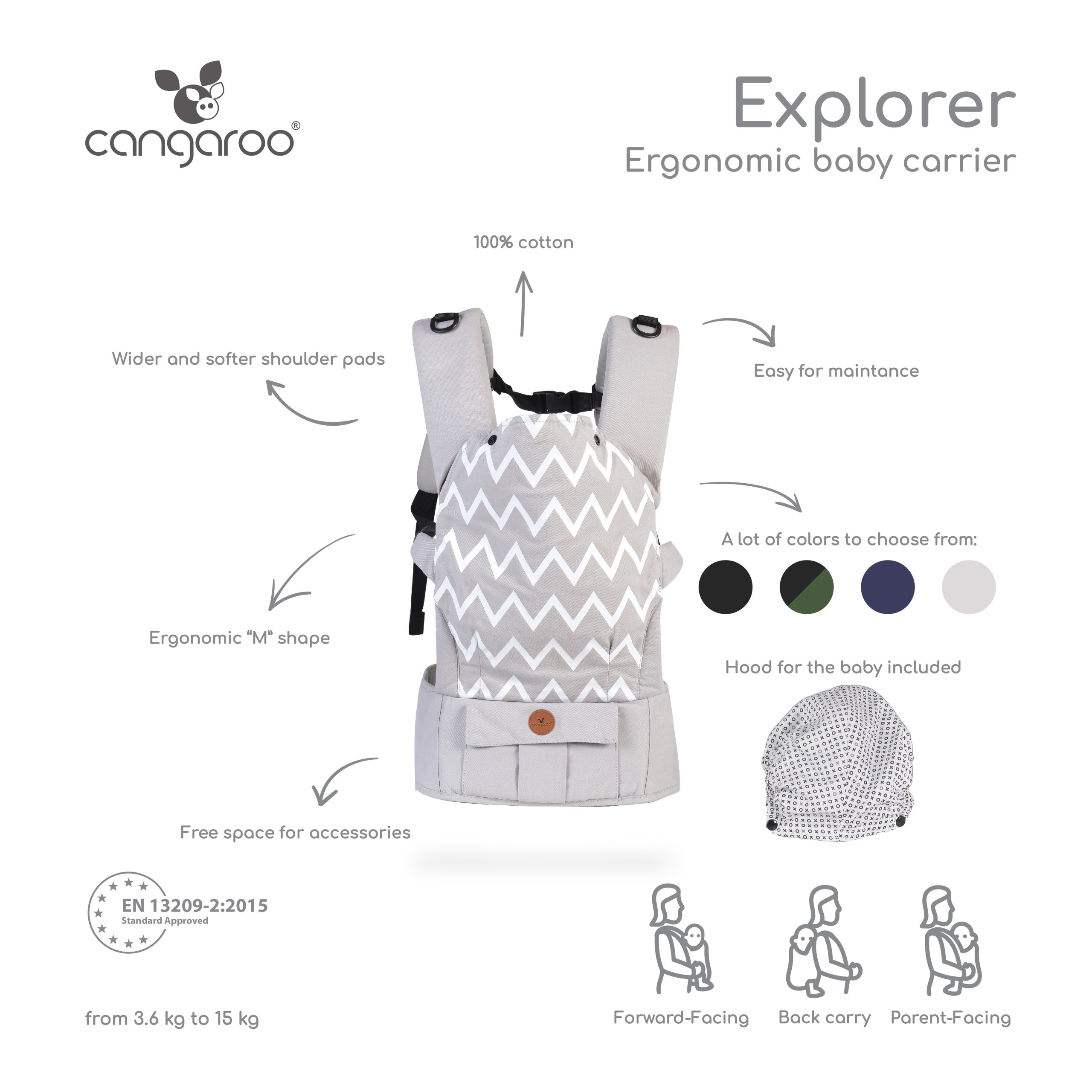 Ergonomic carrier provides carrying in 3 different positions: front and the child is facing the mammy, front and the child looks forward, on the back. The carrier is suitable for children from 3.6 to 15 kg. The carrier`s hood is for protection from the sun, wind or for discretion. When not in use, the hood can be retracted. The carrier is made of cotton and is suitable for machine washing at 30 degrees.