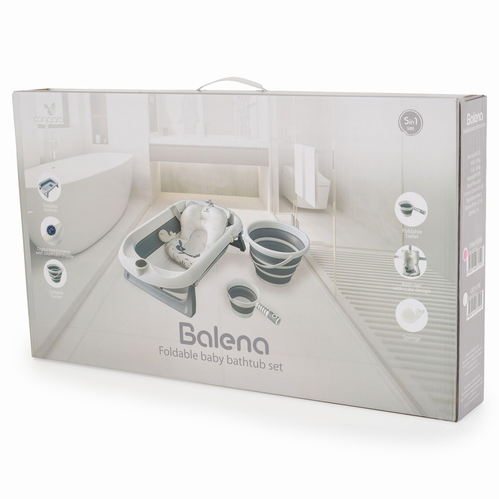 The Balena Foldable Baby Bath Set is a practical solution for modern families, suitable for newborns from 0+ months. The set includes a foldable bathtub, bucket, and rinsing jug, a soft bath pad (43×33 cm), and a sponge. It features a built-in LED thermometer with a three-color display for easy temperature control, a non-slip base, wall-mounting option, anti-slip feet for added stability, and a drainage hole with a plug for quick and easy water release. Made from high-quality, non-toxic materials, it ensures both comfort and safety for your baby.