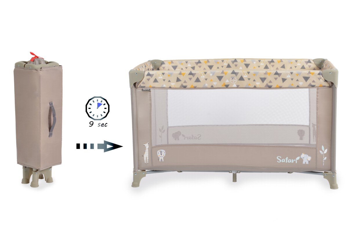 Child folding playpen; suitable for domestic usage and when traveling; easy for carrying and less space, when folded; ensures place for playing for your child; big net windows, suitable for looking the child; sideway zipper entrance