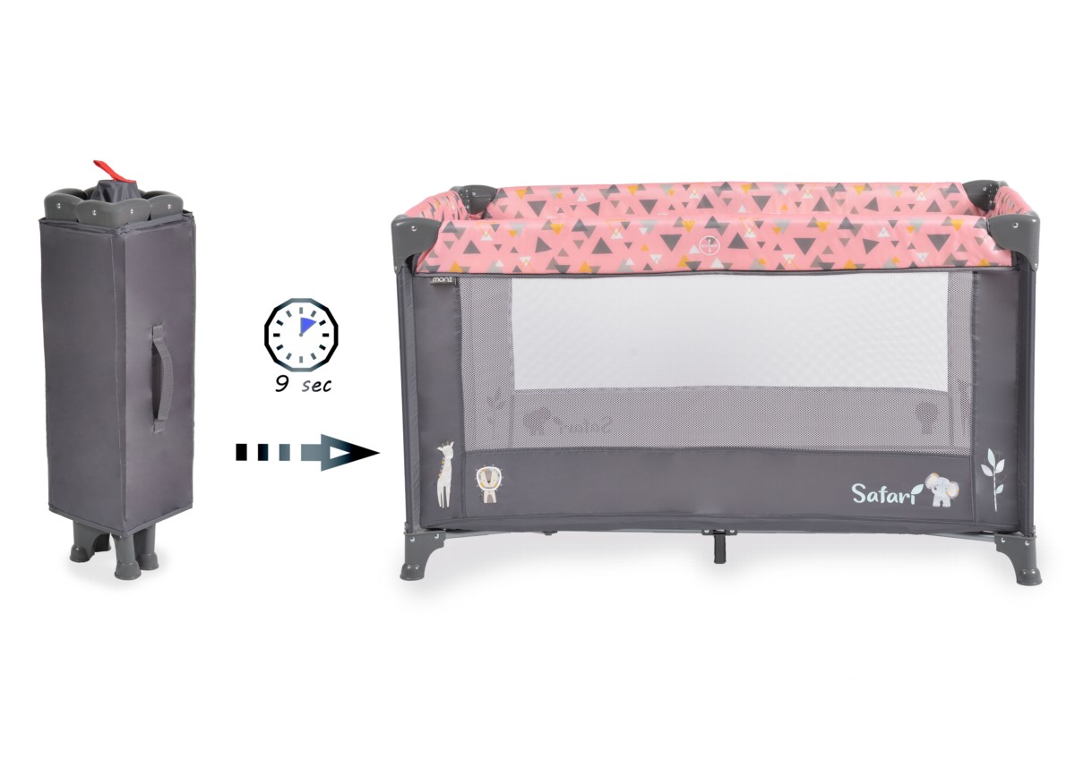 Child folding playpen; suitable for domestic usage and when traveling; easy for carrying and less space, when folded; ensures place for playing for your child; big net windows, suitable for looking the child; sideway zipper entrance
