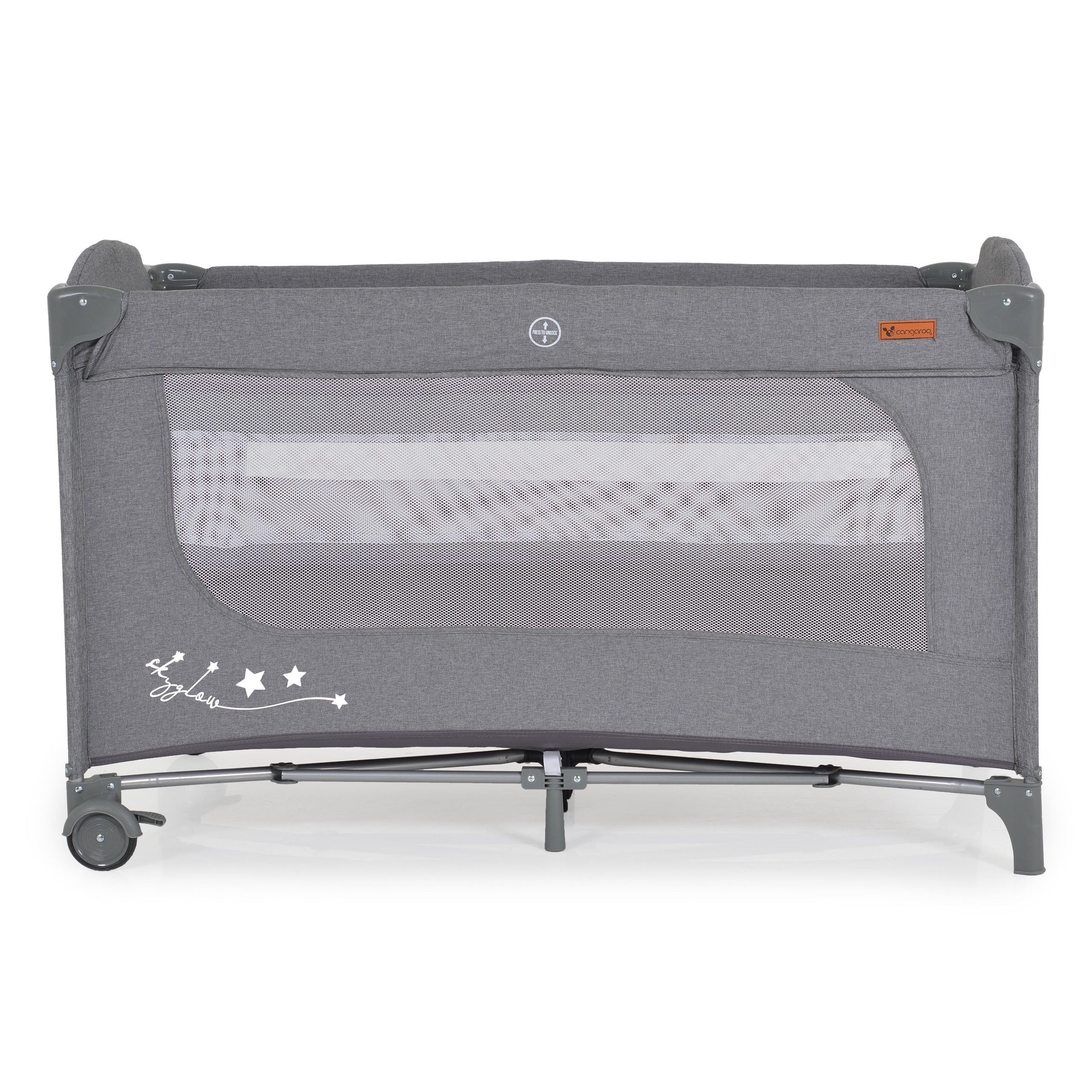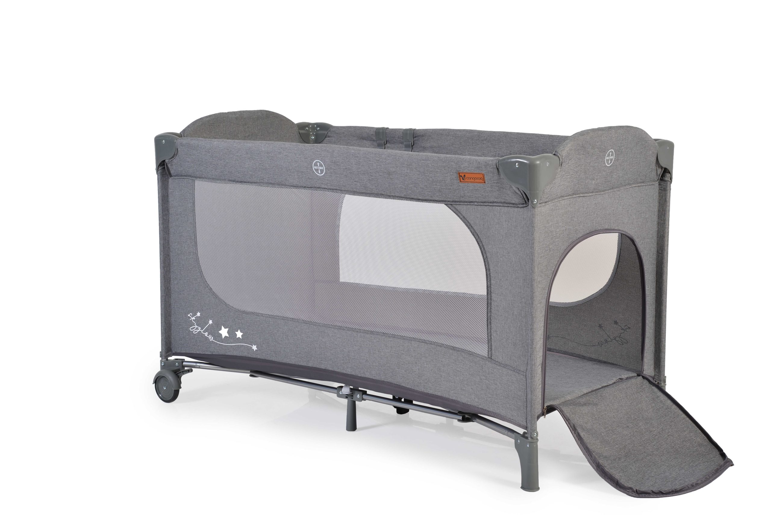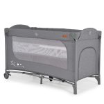 The folding playpen Skyglow 2 with its two levels is suitable for sleep and play for children up to 14 kg. The set includes bag for storage and transportation, mattress with 1.5 cm thickness and 2 hanging rings. There are 2 wheels with stoppers for easy moving and a zipper entrance for bigger child.