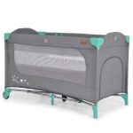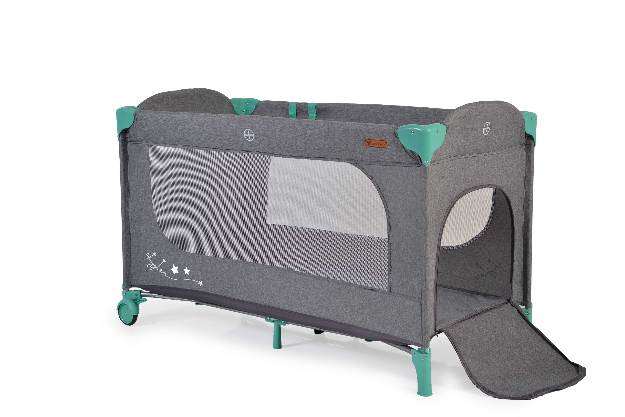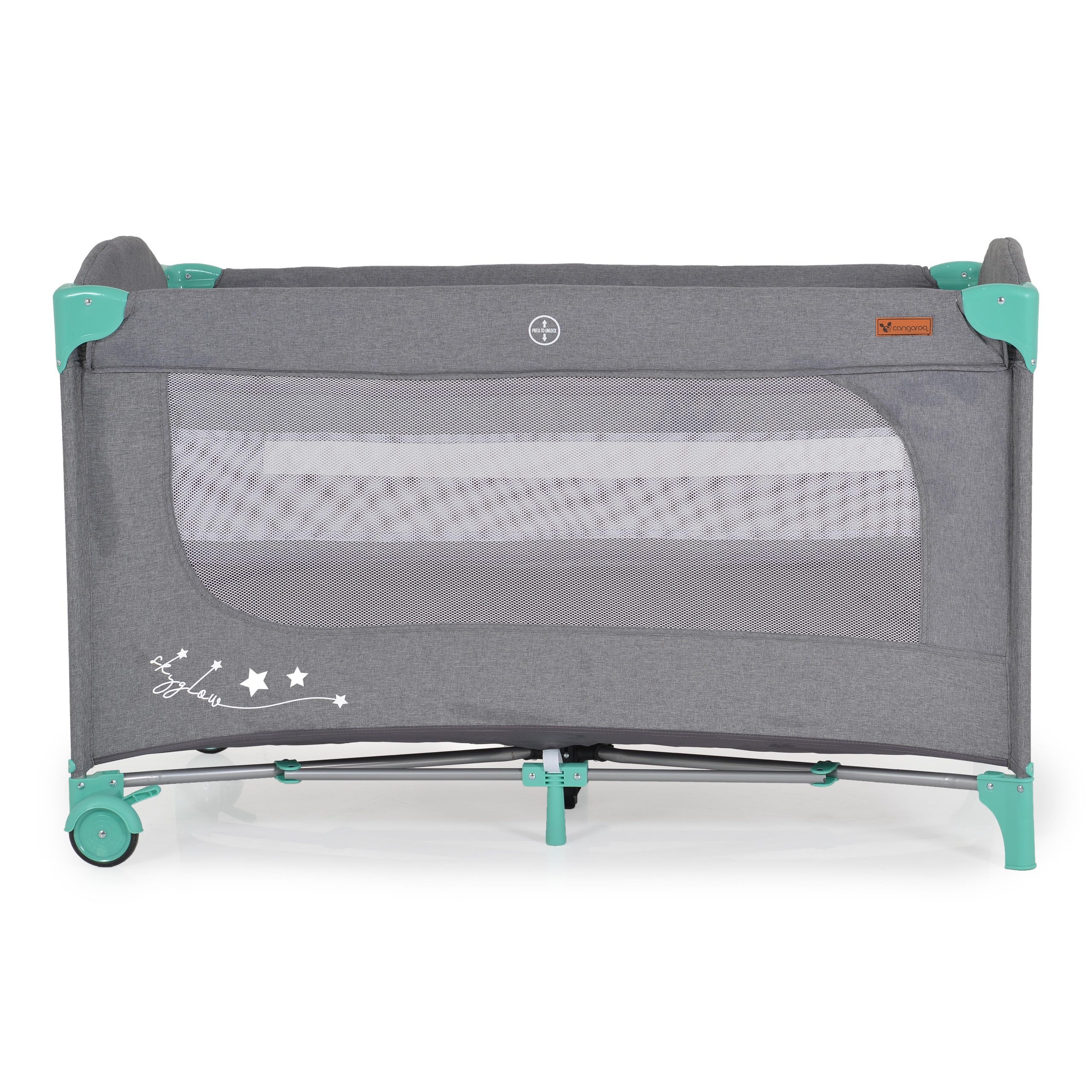 The folding playpen Skyglow 2 with its two levels is suitable for sleep and play for children up to 14 kg. The set includes bag for storage and transportation, mattress with 1.5 cm thickness and 2 hanging rings. There are 2 wheels with stoppers for easy moving and a zipper entrance for bigger child.