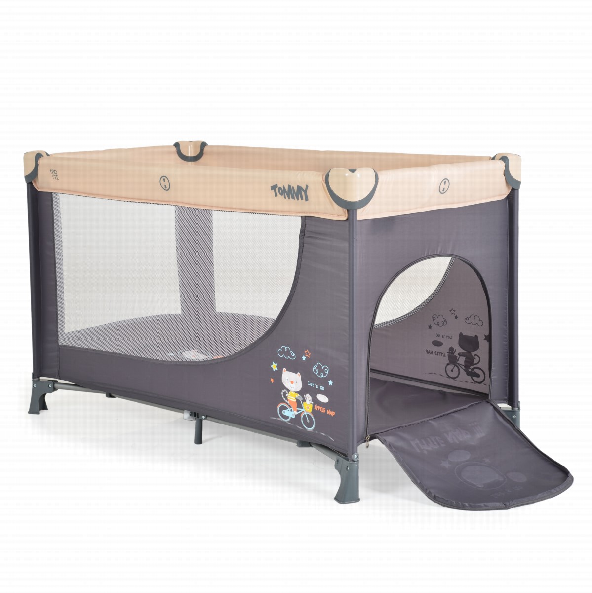 Folding cot Tommy is with 2 levels adjustment of the mattress height. Suitable from birth up to 3 years of age. Practical and compact, providing your child a great place to play. Optimally secured and suitable for sleeping. Upper level with zipper ideal from birth to 3-4 months or until the baby can sit upright unaided. Large side windows to supervise the child. Suitable for sleeping and playing and long frequent travelling. Side entrance with a zipper providing your baby with a way in and out of the play yard, when crawling. Included in the set: Folding mattress, Carry bag.
