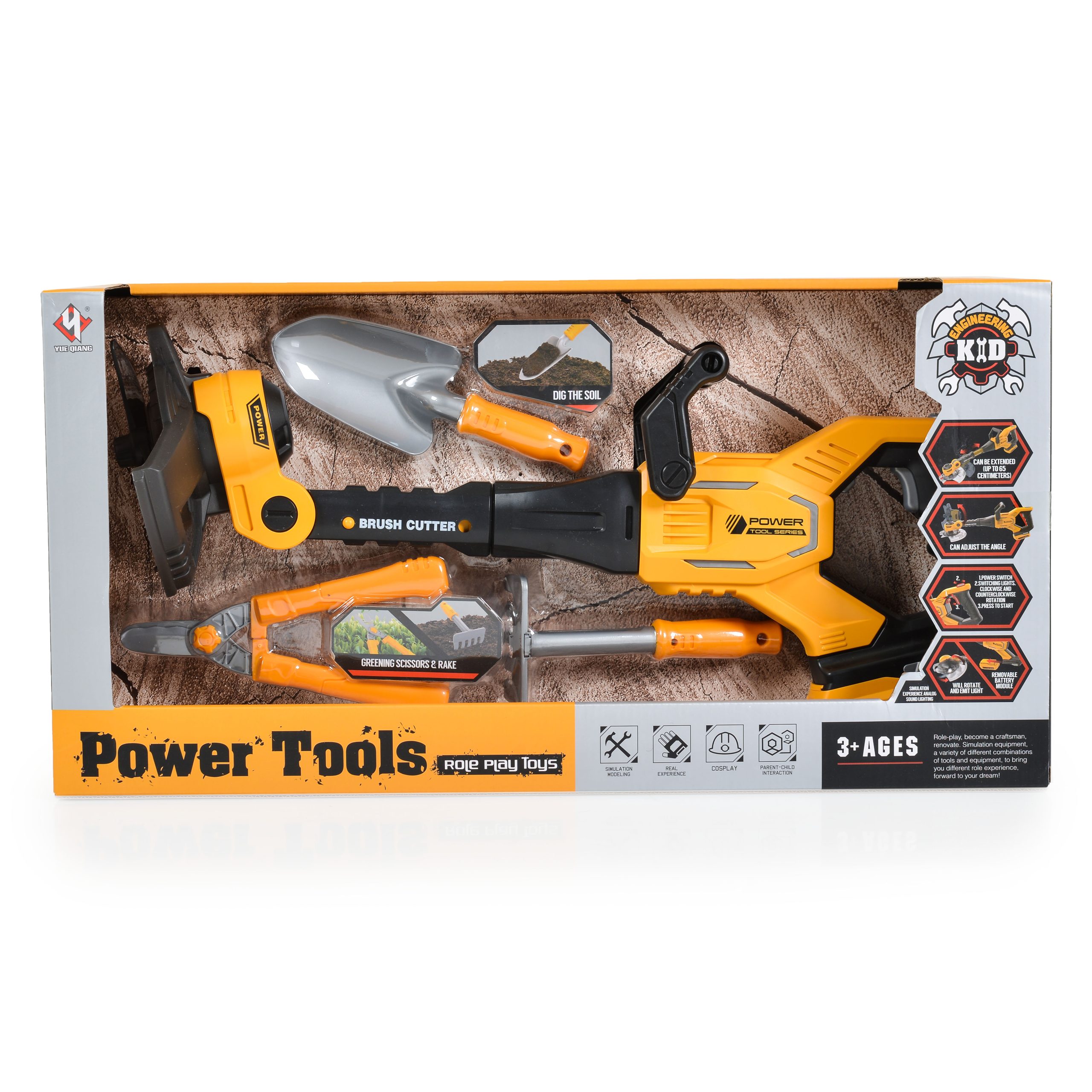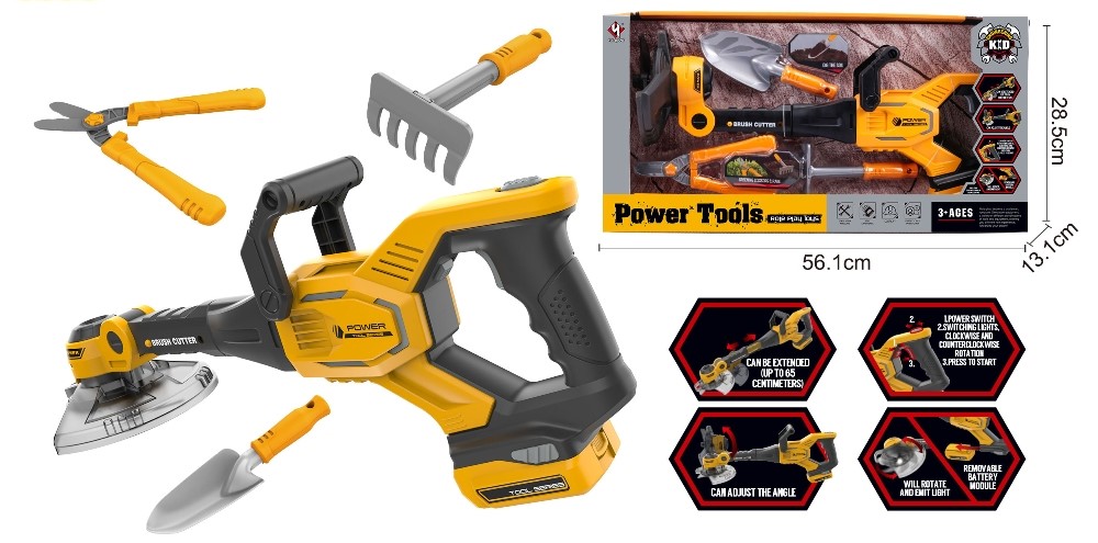 Realistic garden kit including trimmer and garden tools. The trimmer has sound and light, the length is adjustable up to 65 centimeters. The angle can be adjusted. There is an on and off button.