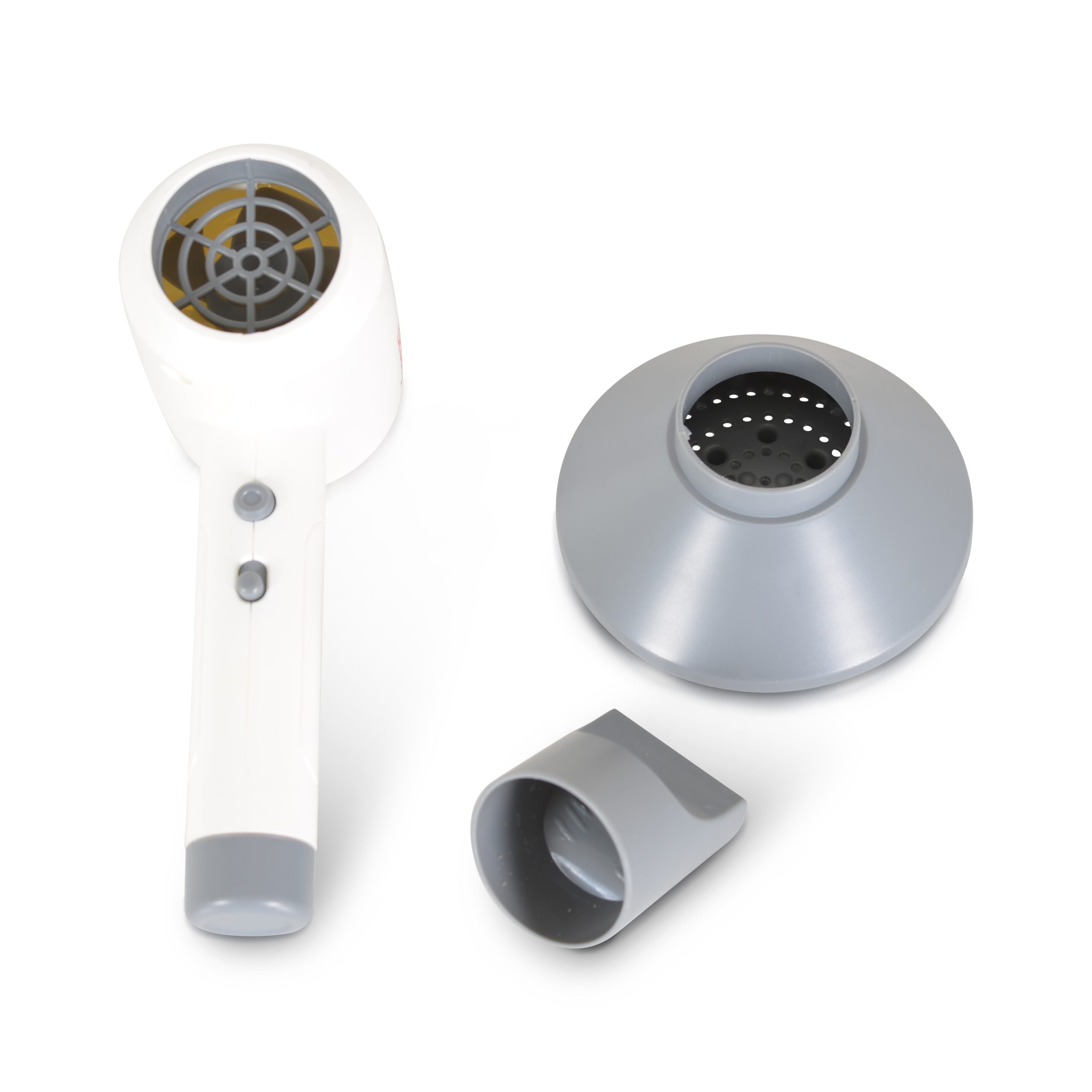 The toy has a realistic design, functions, sound and simulated real hair drier. Really blows air. It is suitable for children over 3 years old. The set includes diffuser nozzle and styling nozzle. The toy develops imagination, creativity, fine motor and social skills.
