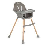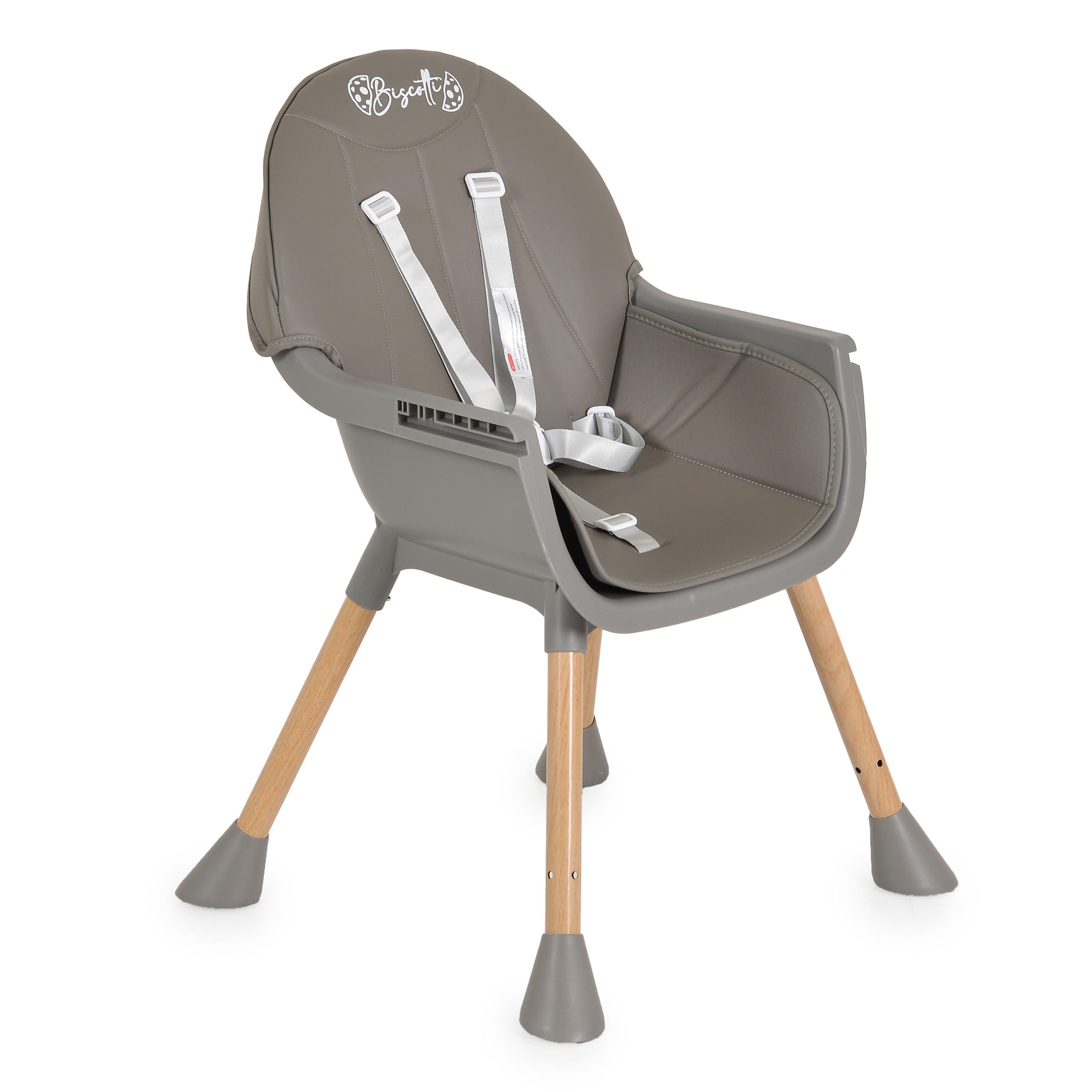 The Biscotti 2-in-1 high chair is stylish and functional, suitable for children over 6 months old and up to 15 kg, with the option to convert into a low chair for older children over 2 years and up to 20 kg. It features a double tray with a cup holder that can be adjusted in two positions or removed entirely. The soft PU leather upholstery is easy to clean, and the 5-point safety harness ensures secure seating. The legs come with stable non-slip caps and a wood-effect finish. The chair is designed for children who can sit unaided.