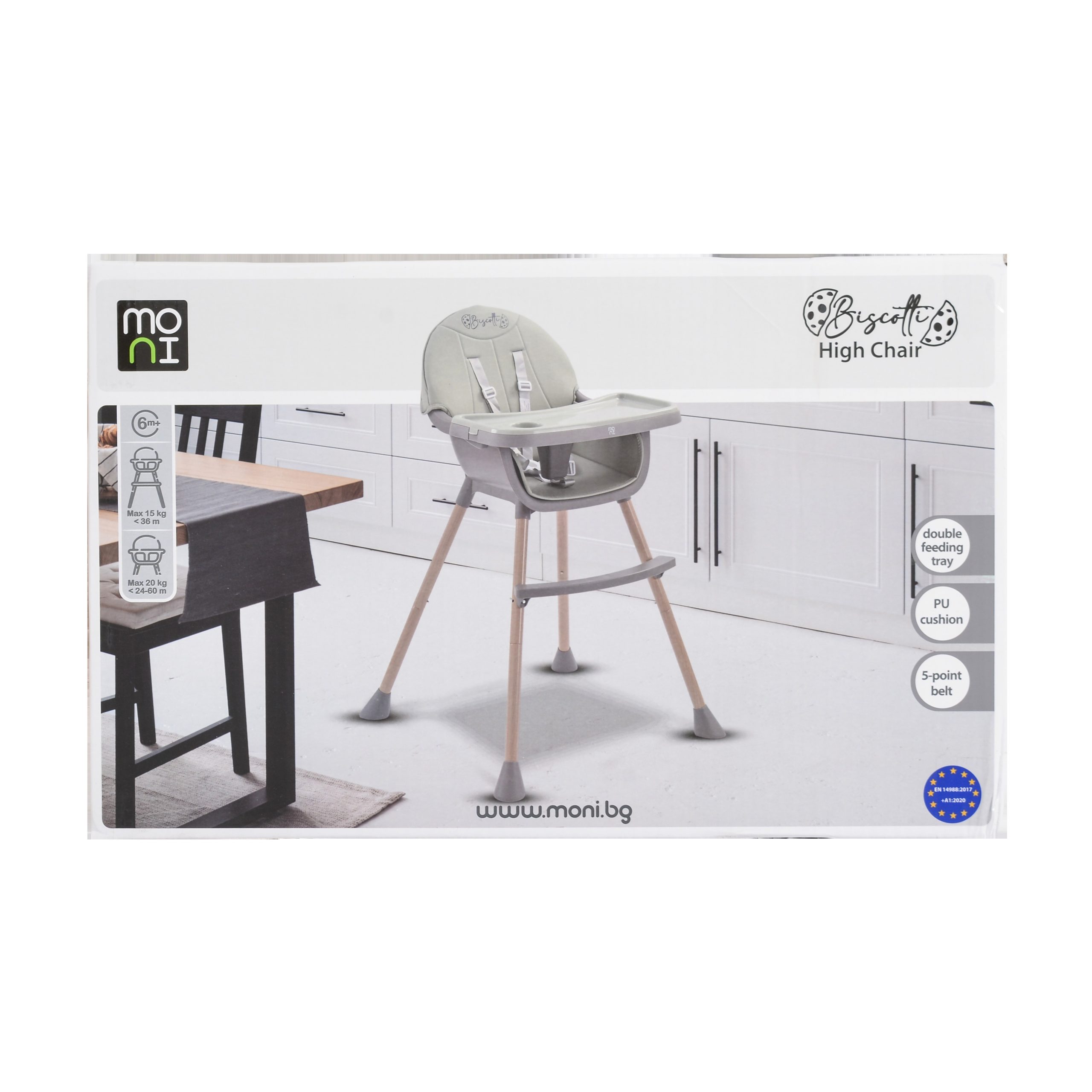 The Biscotti 2-in-1 high chair is stylish and functional, suitable for children over 6 months old and up to 15 kg, with the option to convert into a low chair for older children over 2 years and up to 20 kg. It features a double tray with a cup holder that can be adjusted in two positions or removed entirely. The soft PU leather upholstery is easy to clean, and the 5-point safety harness ensures secure seating. The legs come with stable non-slip caps and a wood-effect finish. The chair is designed for children who can sit unaided.