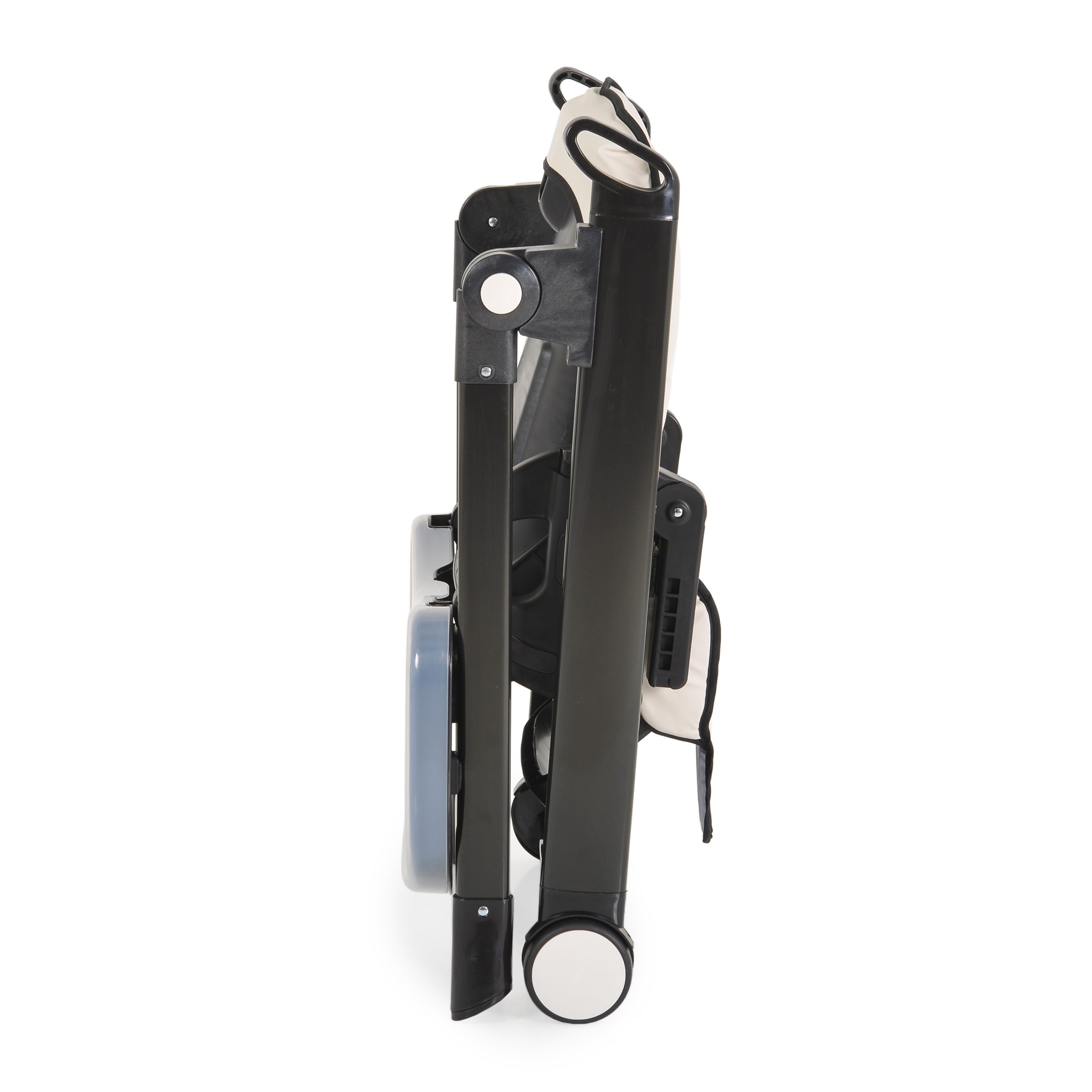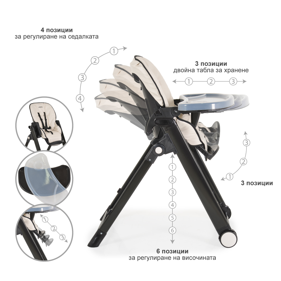 High chair Neron has 6 height positions. The tray is 2-layered with 3 positions. The footrest is adjustable in 3 height positions and 3 angles. The backrest has 4 angle positions. The cushion is made of PU and it`s easy for cleaning. The chair is foldable. The restraint system is with 5 points.