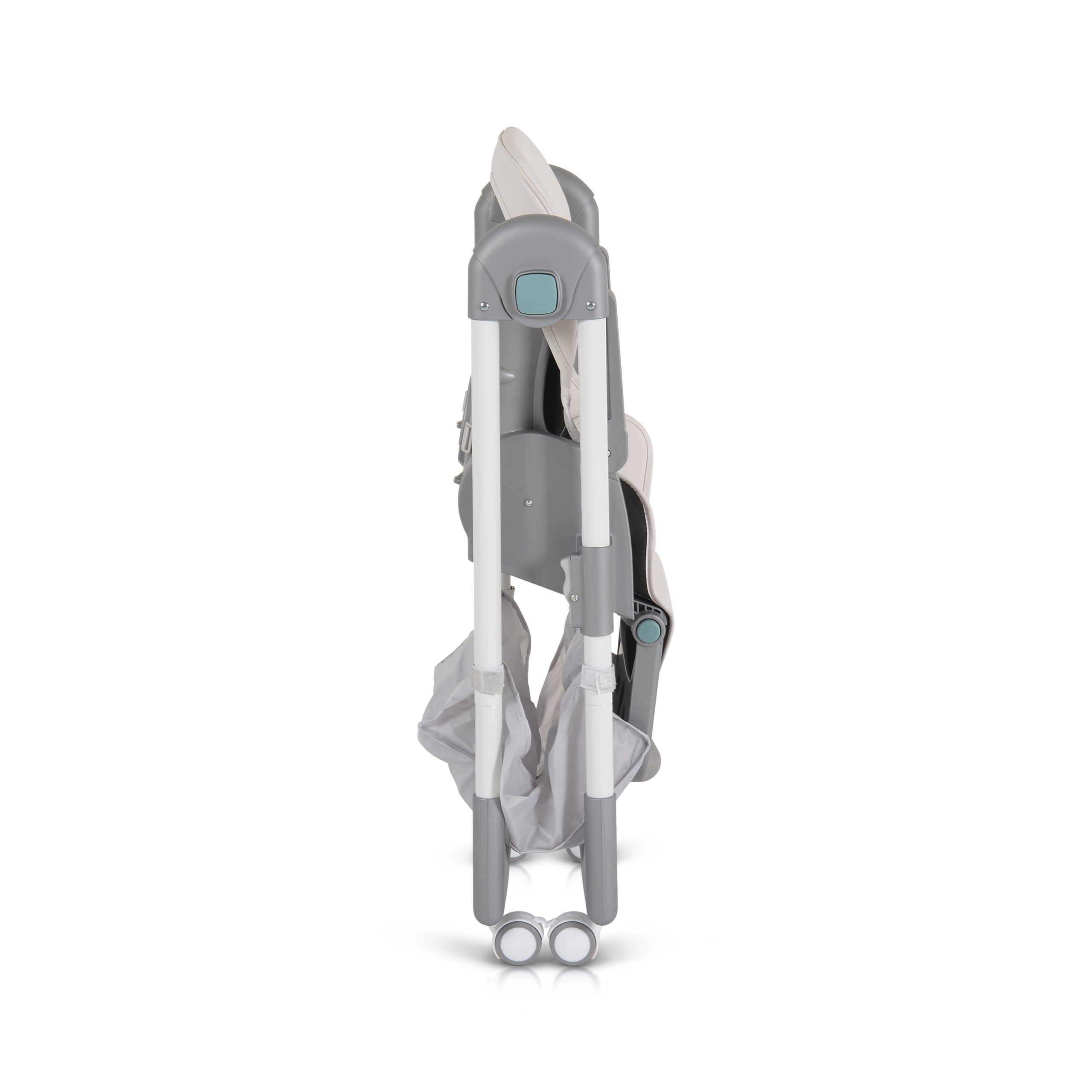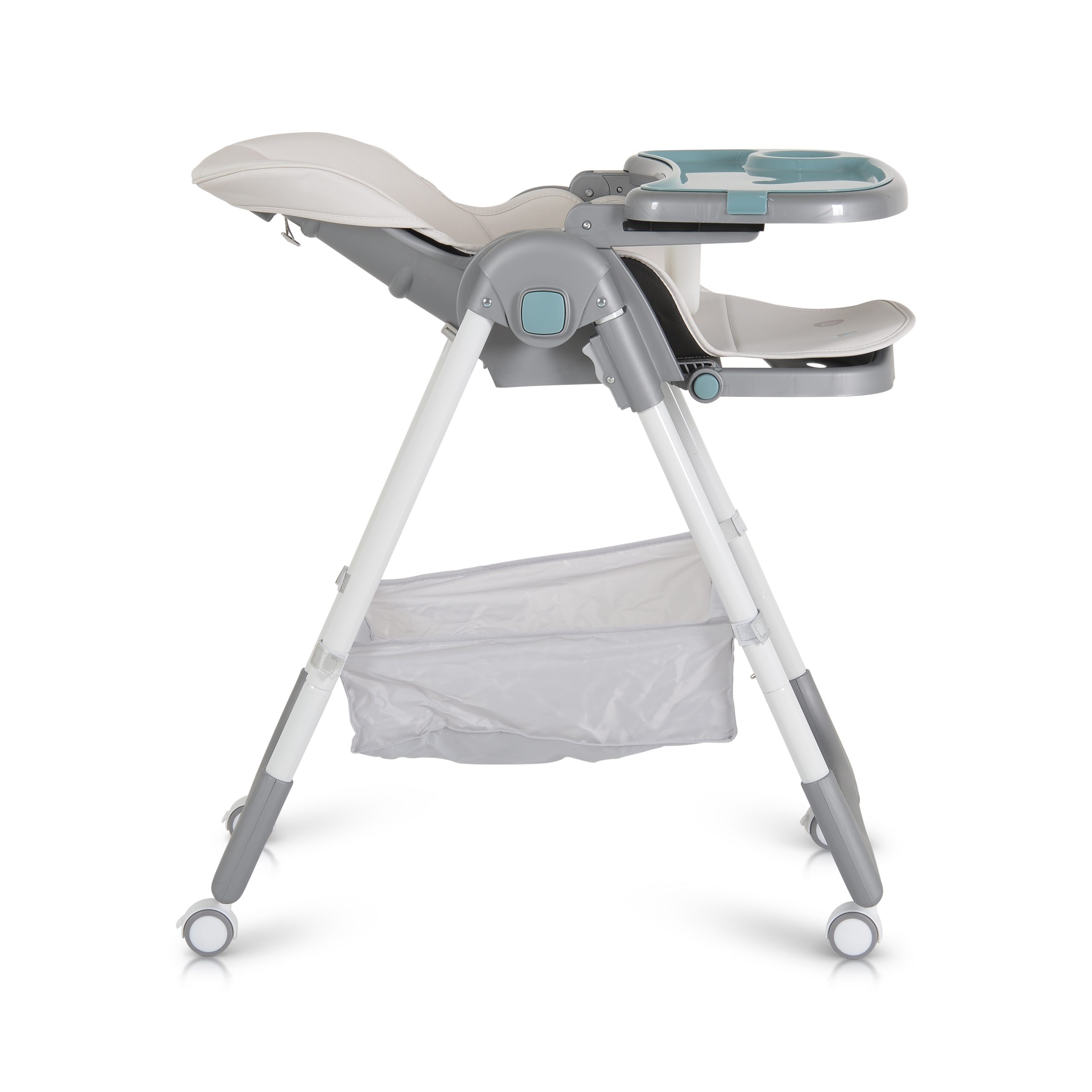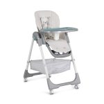 High chair Raffy has 8 height positions. The tray is 2-layered with 3 positions. The footrest is adjustable. The backrest has 4 angle positions. The chair is foldable. It has 4 silicone wheels with stoppers and a basket for accessories. The restraint system is with 5 points.