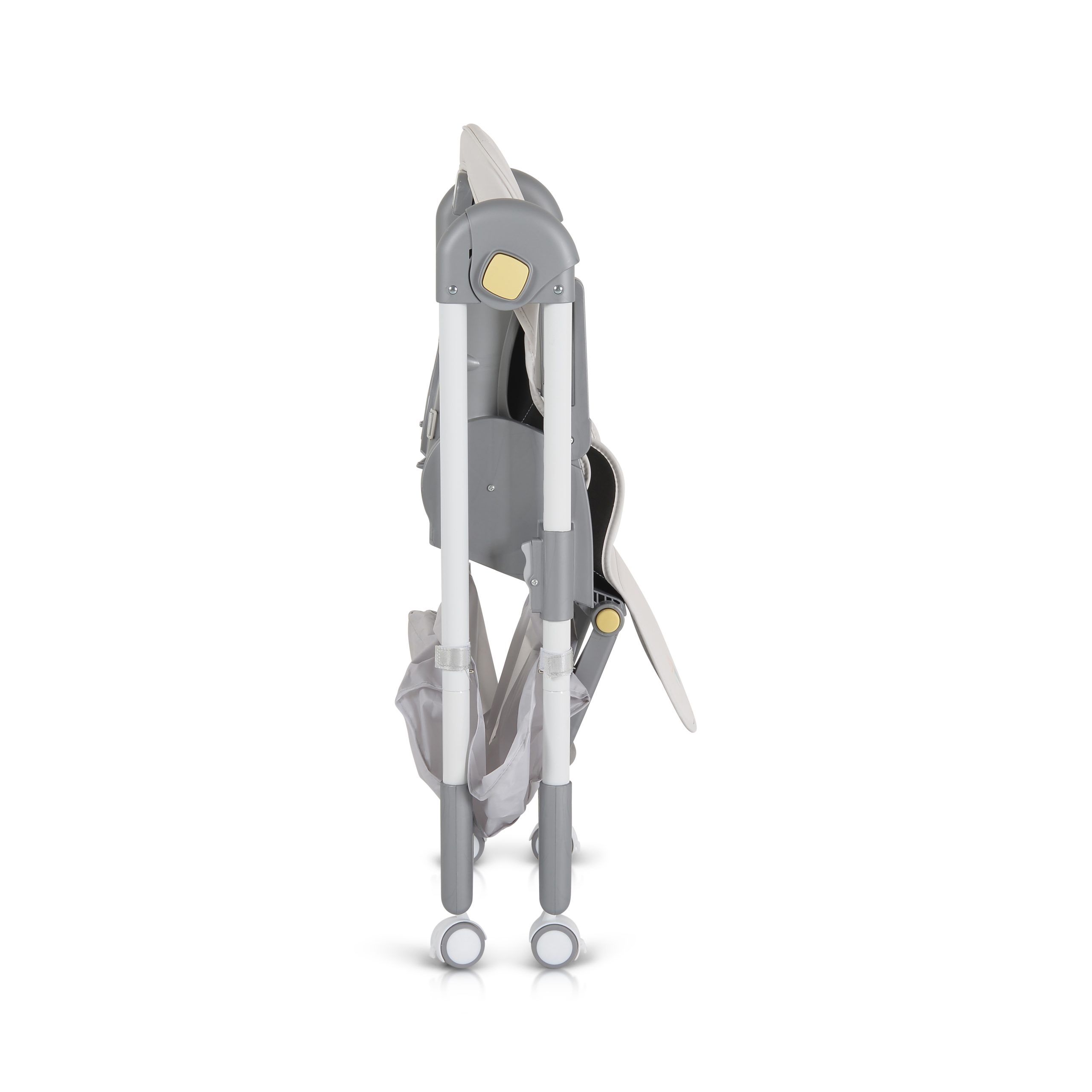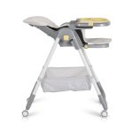 High chair Raffy has 8 height positions. The tray is 2-layered with 3 positions. The footrest is adjustable. The backrest has 4 angle positions. The chair is foldable. It has 4 silicone wheels with stoppers and a basket for accessories. The restraint system is with 5 points.