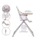 The high chair is intended for children over 6 months and with a maximum weight up to 15 kg. Compact design. Easy folding and unfolding. The product has an accessory basket. PVC coated seat pad for easy cleaning. Fresh design and pleasant colors. The product is equiped with 5 – point safety harness