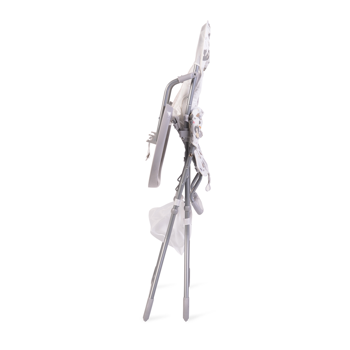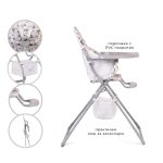 The high chair is intended for children over 6 months and with a maximum weight up to 15 kg. Compact design. Easy folding and unfolding. The product has an accessory basket. PVC coated seat pad for easy cleaning. Fresh design and pleasant colors. The product is equiped with 5 – point safety harness